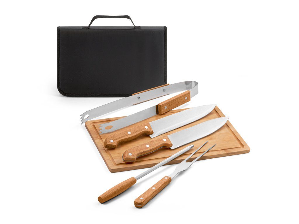 Set na grilovanie s doskou v praktickom púzdre na zips, vybavená nastaviteľným popruhom pre pohodlné nosenie.