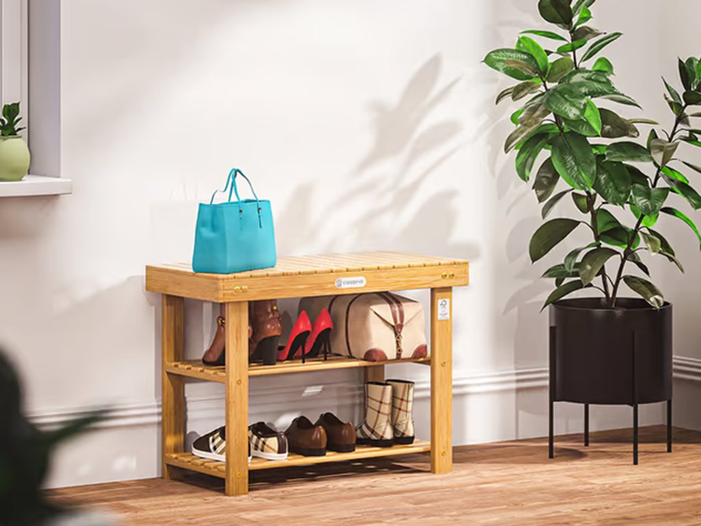 Štýlový botník z masívneho akáciového dreva slúži zároveň ako praktická lavica na sedenie, takže si pohodlne obujete aj vyzujete topánky. Pevné police poskytujú dostatok priestoru na prehľadné uloženie obuvi a samotná lavica môže slúžiť aj ako odkladacia plocha.