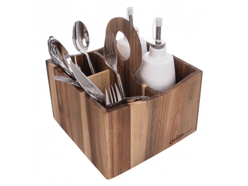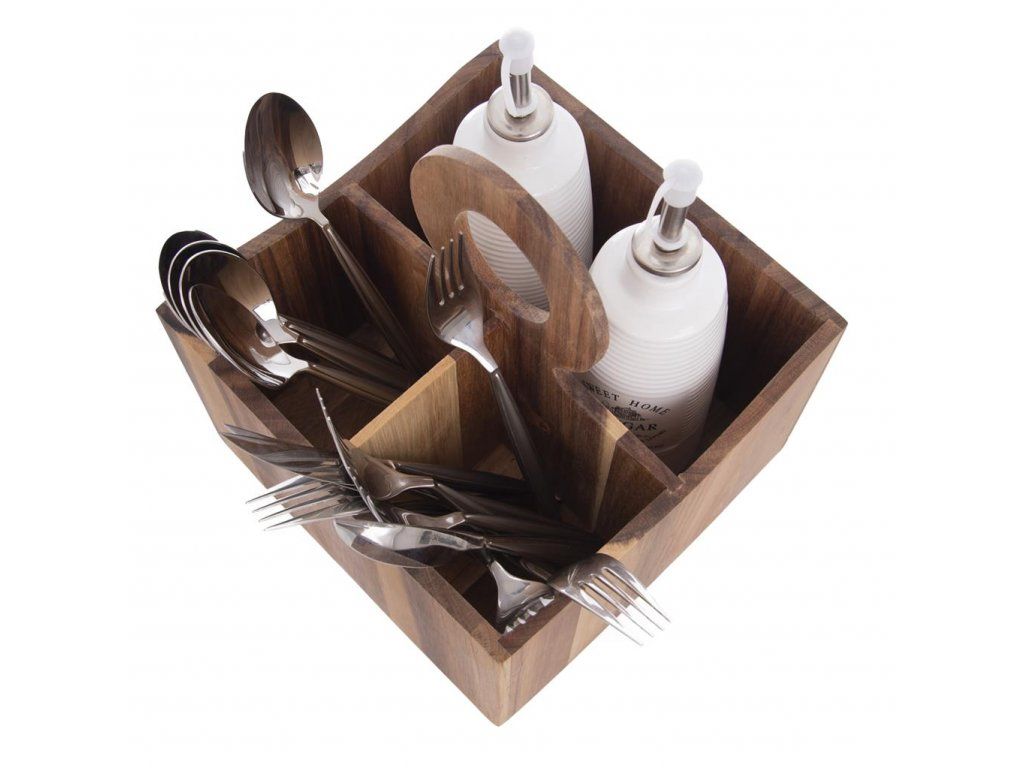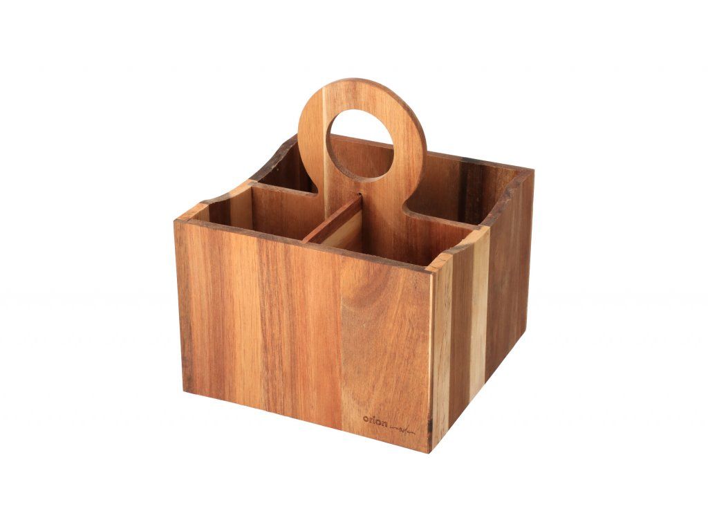 Stojan z akáciového dreva je skvelý na uloženie príborov, ale tiež dochucovadiel, omáčok či obrúskov. Má tri priehradky a vďaka drevenej rukoväti sa ľahko prenáša.