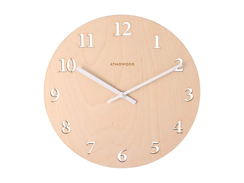 Nástenné hodiny z dreva svetlej brezy sa pýšia nadčasovým dizajnom za nízku cenu. Čísla sú do ciferníka vyrezané a strojček je tichý a spoľahlivý.