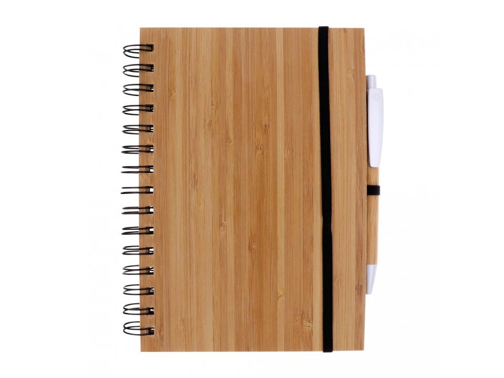 Súčasťou balenia je bambusové guľôčkové pero a gumička, ktorá slúži na uzavretie bloku.