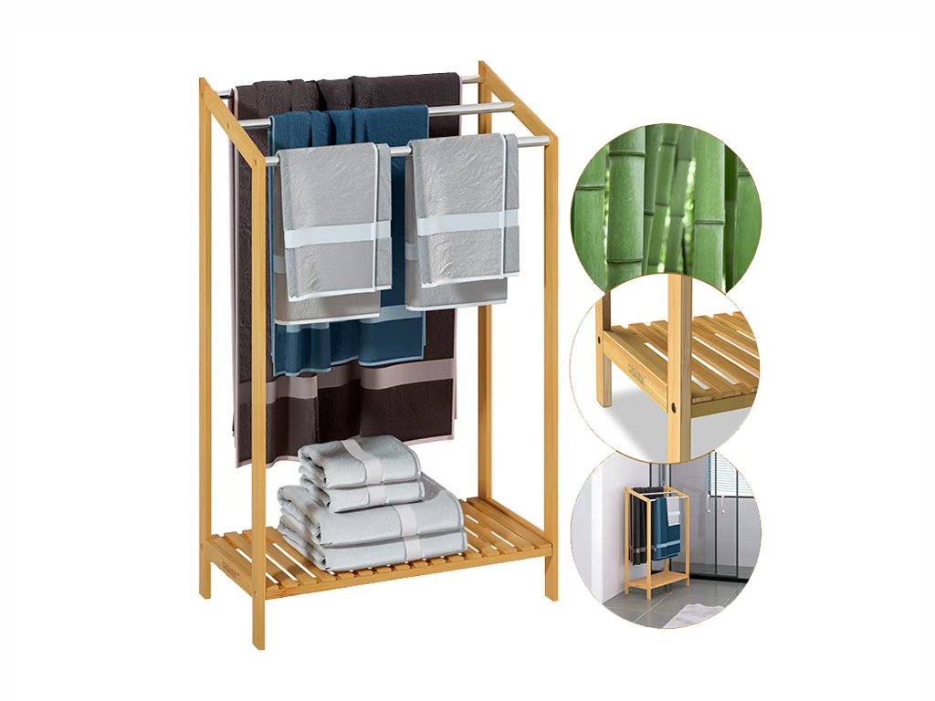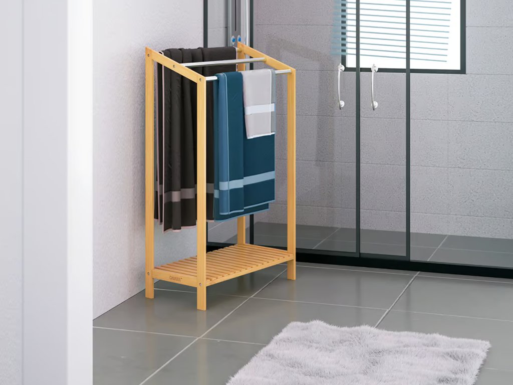 Voľne stojaci držiak na uteráky je vybavený tromi tyčami usporiadanými do schodového tvaru, čo zaisťuje optimálnu cirkuláciu vzduchu a rýchle schnutie uterákov bez nepríjemného zápachu.