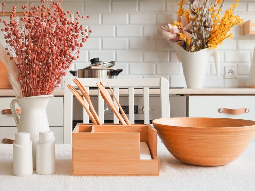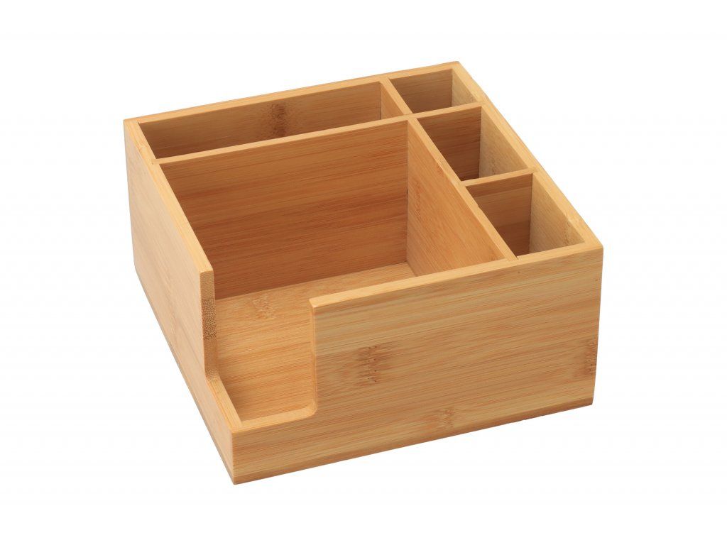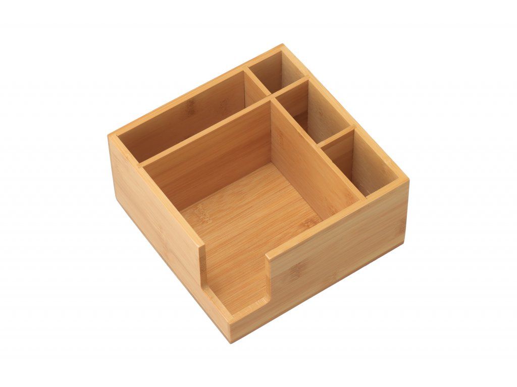Bambusový stojan so štyrmi priestrannými priehradkami, do ktorých ľahko vložíte všetky potrebné kuchynské doplnky a naviac aj obrúsky.