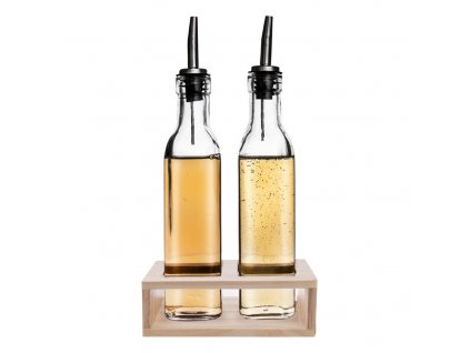 Súprava na dochucovanie v drevenom stojane umožňuje mať olej a ocot vždy poruke ako doma, tak aj na záhrade, či v reštaurácii.