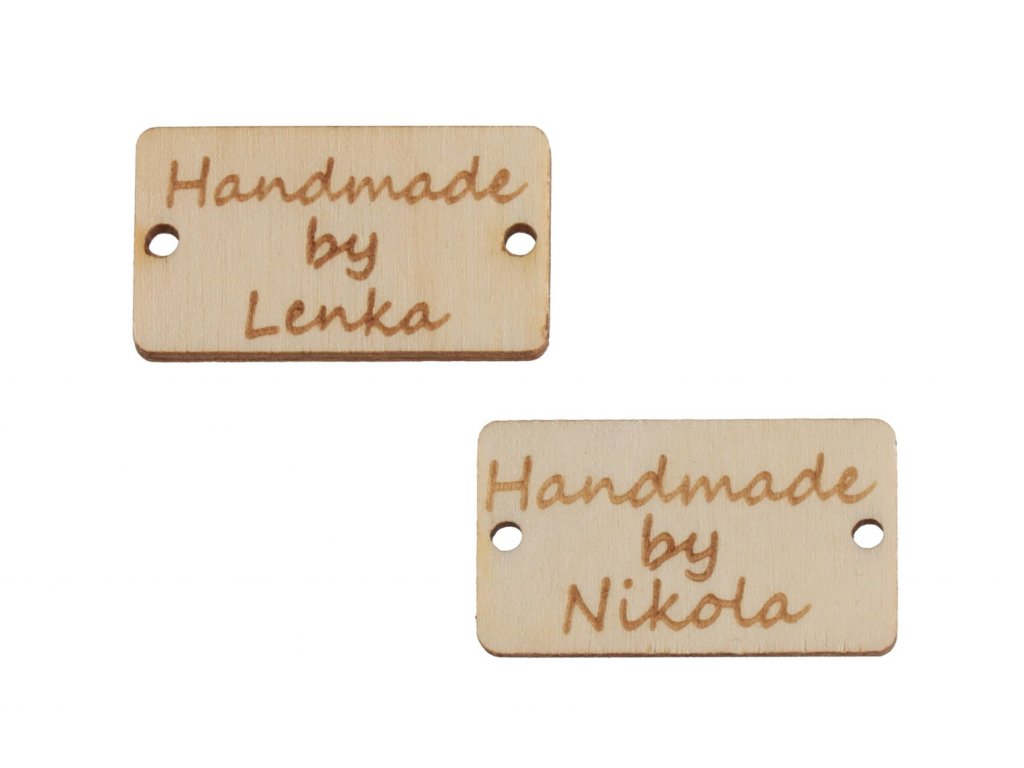 Drevená ceduľka s nápisom Handmade s vlastným menom. Môže slúžiť ako vkusné označenie vášho vlastnoručne vyrobeného výrobku.