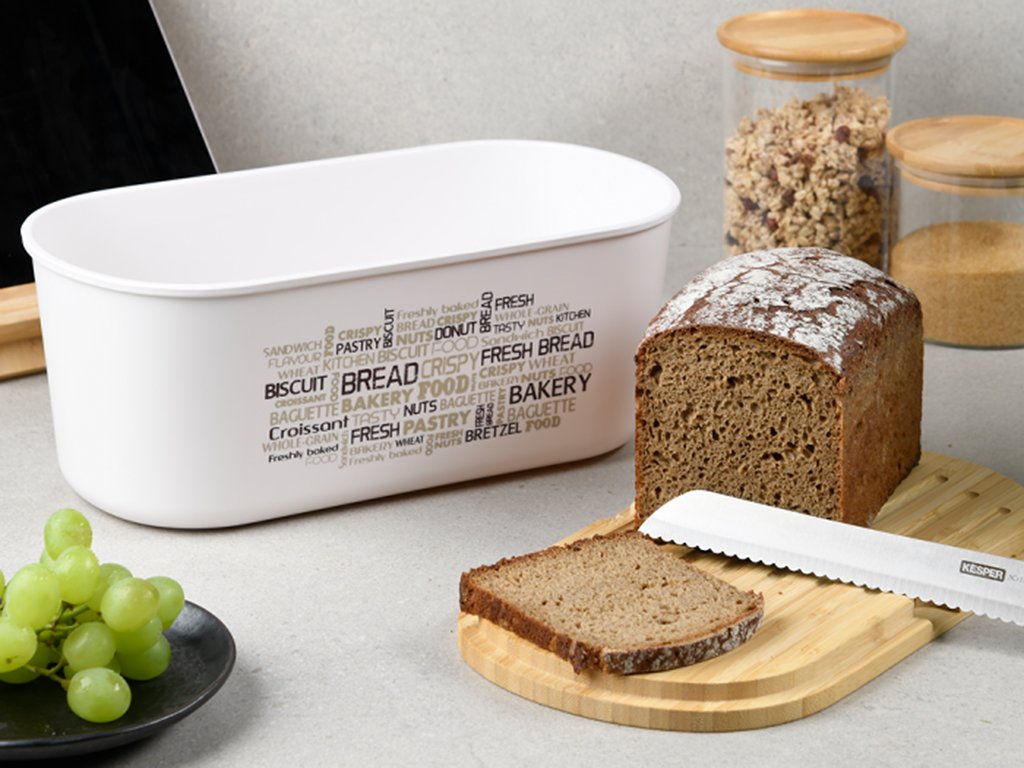Chlebník s krájacou doskou v elegantnej bielej farbe dokonale rozjasní interiér vašej kuchyne. Veko z bukového dreva poslúži ako obojstranná doska na krájanie či servírovanie.