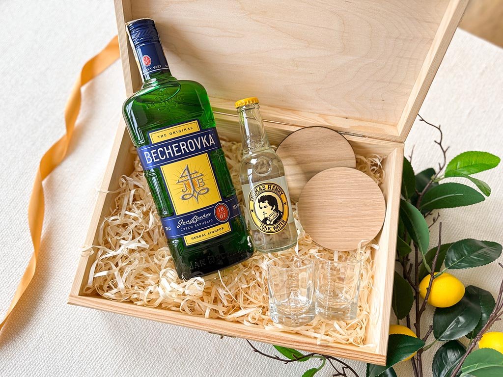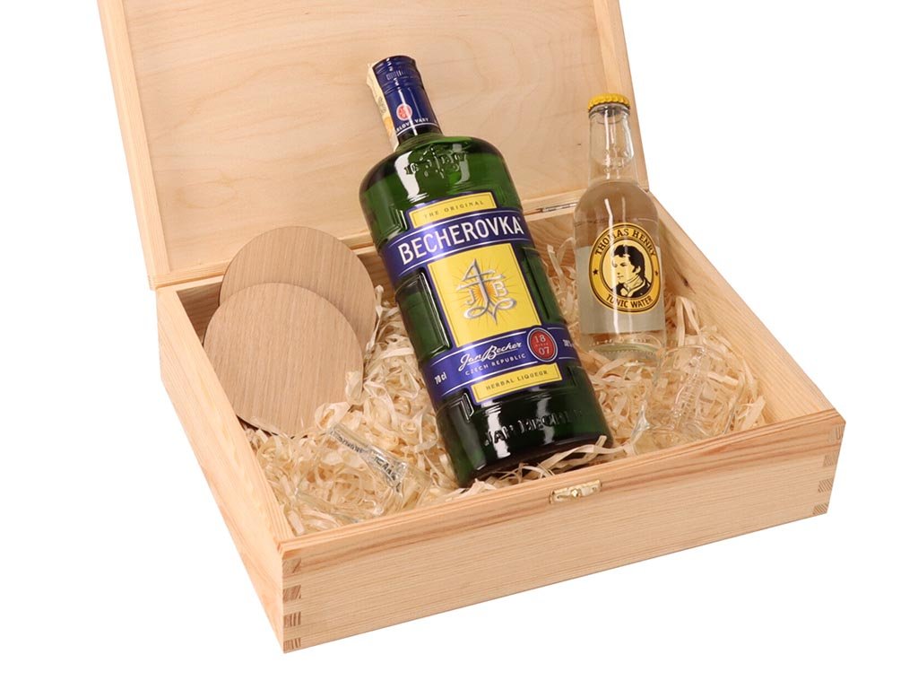 Darček v drevenej krabičke ponúka dokonalú kombináciu bylinného likéru Becherovka a originálneho darčeka na mieru. Poteší nielen znalcov a milovníkov dobrého pitia. Je ideálnym darčekom k narodeninám, k narodeniu dieťaťa, radosť urobí novomanželom, ale aj obchodným partnerom.