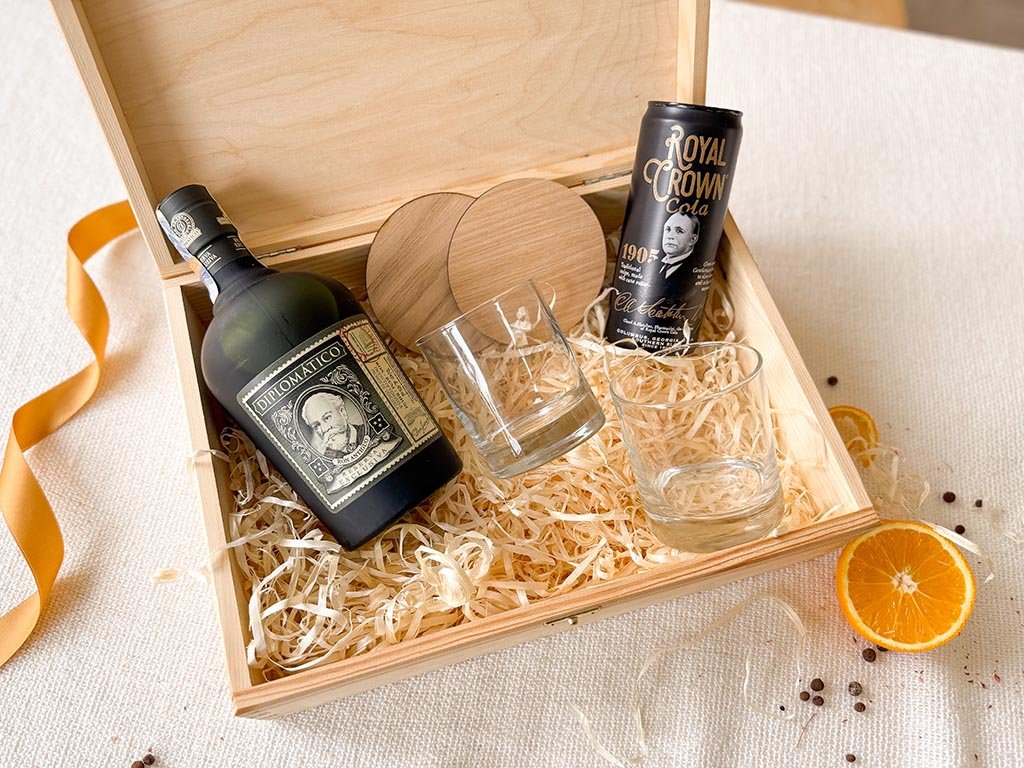 V balení nájdete fľašu Diplomatico Reserva Exclusiva 0,7 l, plechovku Royal Crown Cola 0,33 l, dva poháre a dva štýlové podtácky z dubovej preglejky. Drevená krabička je vystlaná prírodnou drevenou vlnou, ktorá zaistí nielen bezpečnú prepravu, ale tiež zdôrazní výnimočnosť tohto originálneho darčeka.