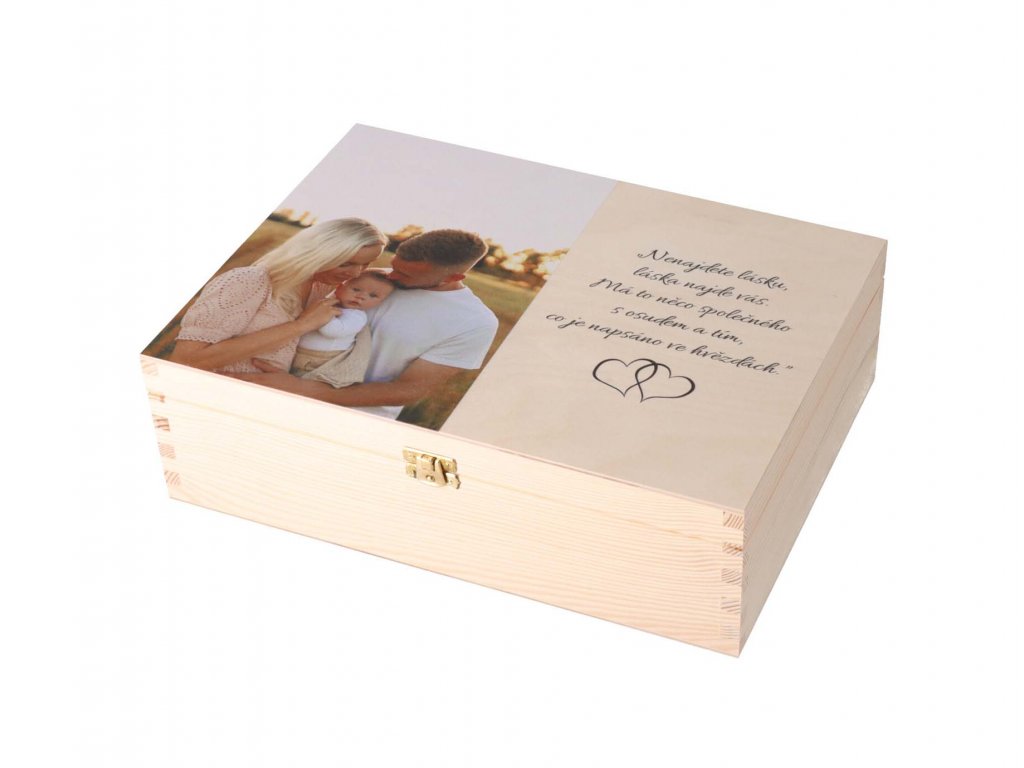 Drevená krabička zaujme svojim jednoduchým, ale jedinečným vzhľadom, ktorý upravíme na mieru. Darček môžete doplniť o gravírovaný text a obrázok, ale môžeme vám naň tiež vypáliť fotografiu alebo ho doplniť kvalitnou farebnou UV tlačou.