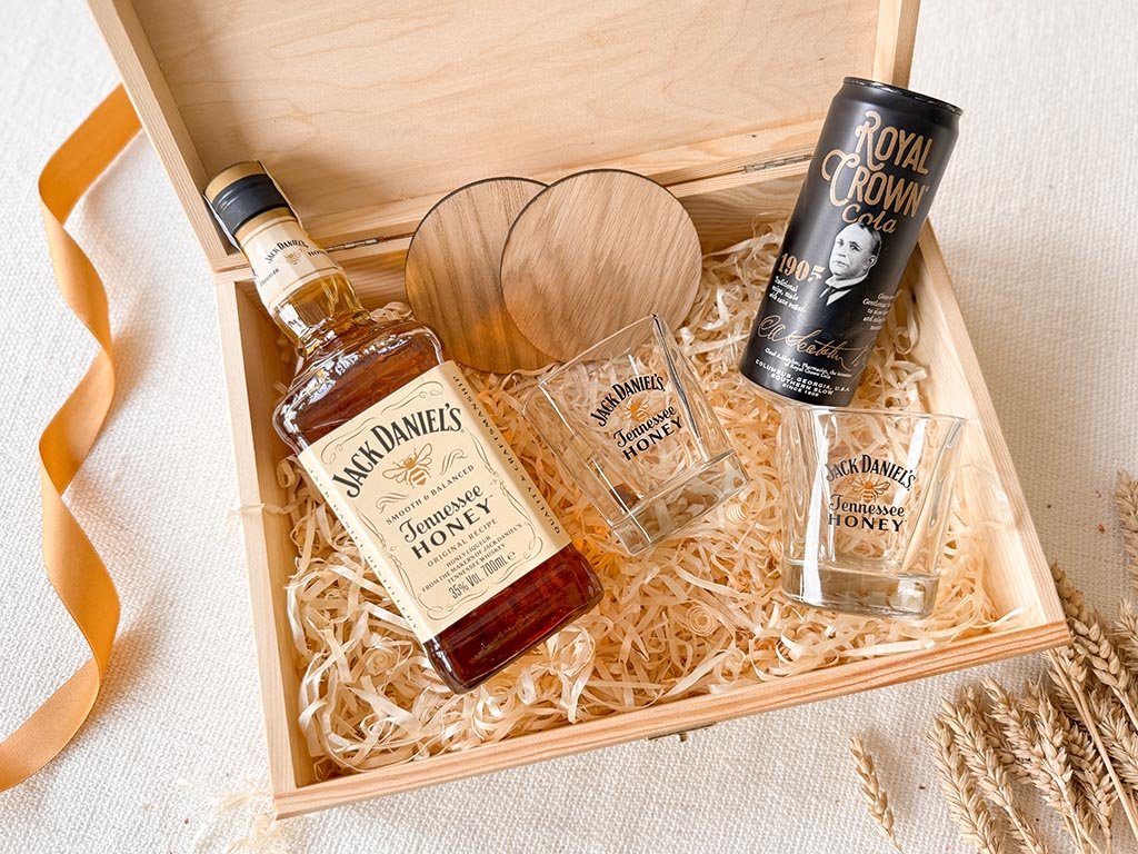 Darčeková súprava v drevenej krabičke ponúka dokonalú kombináciu kvalitnej whiskey Jack Daniel's Honey a originálneho darčeka na mieru. Poteší nielen milovníkov a znalcov dobrého pitia. Je ideálnym darčekom k narodeninám, k narodeniu dieťaťa, radosť urobí novomanželom, ale aj obchodným partnerom.