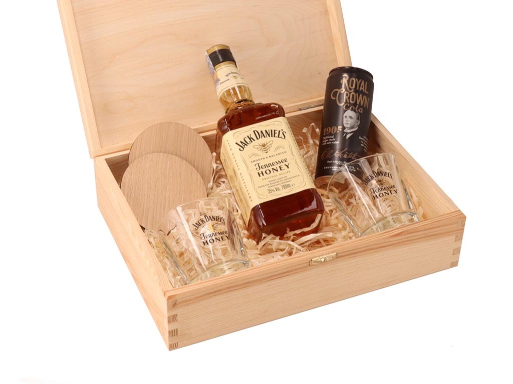 V balení nájdete fľašu pravej americkej whiskey Jack Daniel's Honey 0,7 l, plechovku Royal Crown Cola 0,33 l, dva poháre a dva štýlové podtácky z dubovej preglejky. Drevená krabička je vystlaná prírodnou drevenou vlnou, ktorá zaistí nielen bezpečnú prepravu, ale tiež zdôrazní výnimočnosť tohto originálneho darčeka.