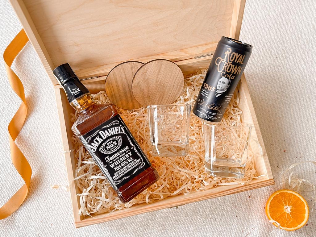 Darčeková súprava v drevenej krabičke ponúka dokonalú kombináciu kvalitnej whiskey Jack Daniel's a originálneho darčeka na mieru. Poteší nielen milovníkov a znalcov dobrého pitia. Je ideálnym darčekom k narodeninám, k narodeniu dieťaťa, radosť urobí novomanželom, ale aj obchodným partnerom.