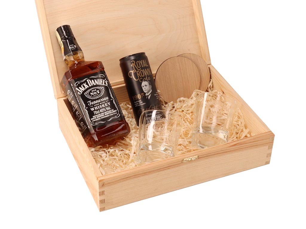 V balení nájdete fľašu pravej americkej Jack Daniel's Tennessee Whiskey 0,7 l, plechovku Royal Crown Cola 0,33 l, dva poháre a dva štýlové podtácky z dubovej preglejky. Drevená krabička je vystlaná prírodnou drevenou vlnou, ktorá zaistí nielen bezpečnú prepravu, ale tiež zdôrazní výnimočnosť tohto originálneho darčeka.