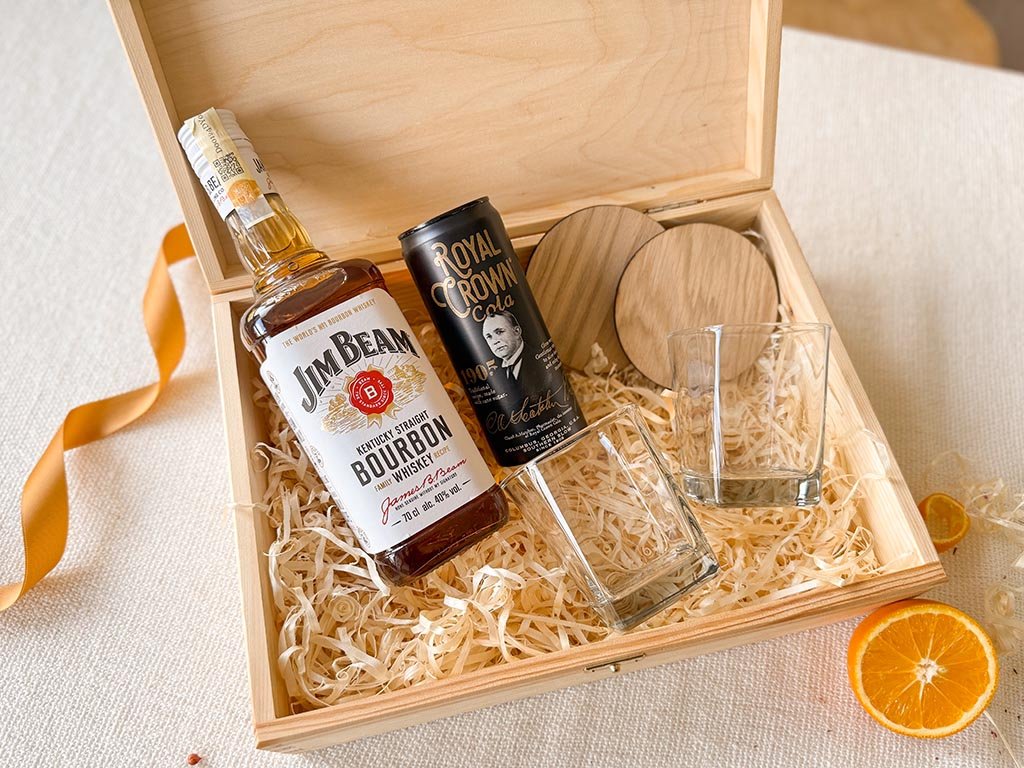V balení nájdete fľašu pravej bourbon whiskey Jim Beam 0,7 l, plechovku Royal Crown Cola 0,33 l, dva poháre a dva štýlové podtácky z dubovej preglejky. Drevená krabička je vystlaná prírodnou drevenou vlnou, ktorá zaistí nielen bezpečnú prepravu, ale tiež zdôrazní výnimočnosť tohto originálneho darčeka.