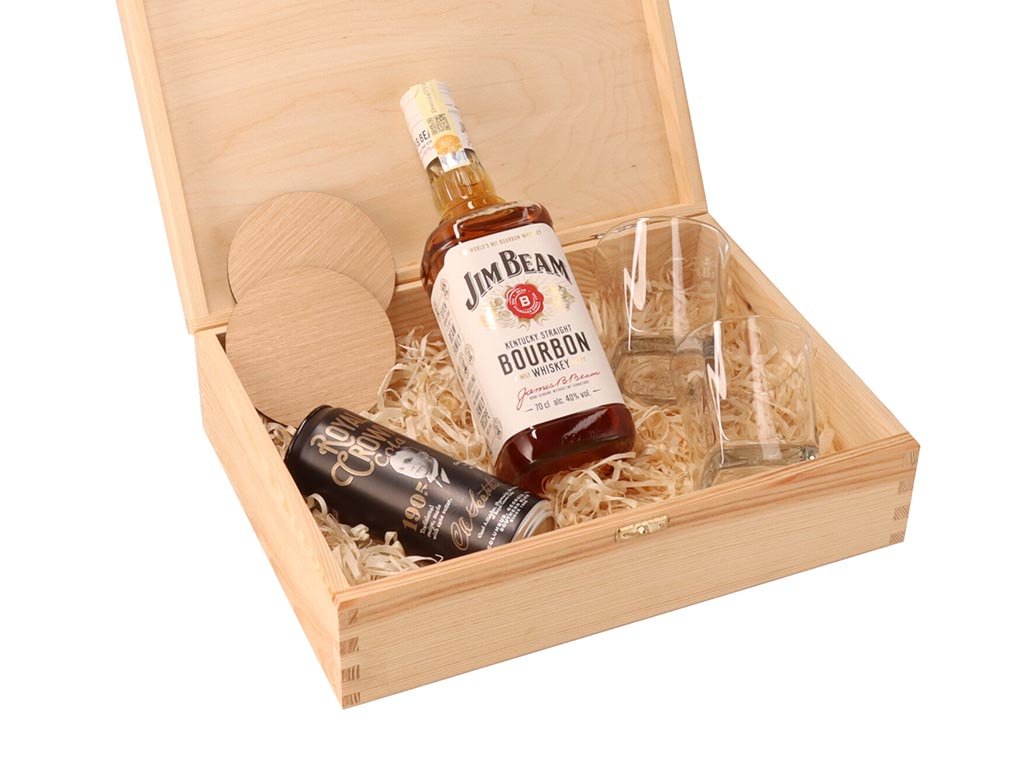 Darčekové balenie v drevenej krabičke ponúka dokonalú kombináciu skvelej whiskey Jim Beam a originálneho darčeka na mieru. Poteší nielen milovníkov a znalcov dobrého pitia. Je ideálnym darčekom k narodeninám, k narodeniu dieťaťa, radosť urobí novomanželom, ale aj obchodným partnerom. Drevená krabička zaujme svojim jednoduchým, ale jedinečným vzhľadom, ktorý upravíme na mieru.