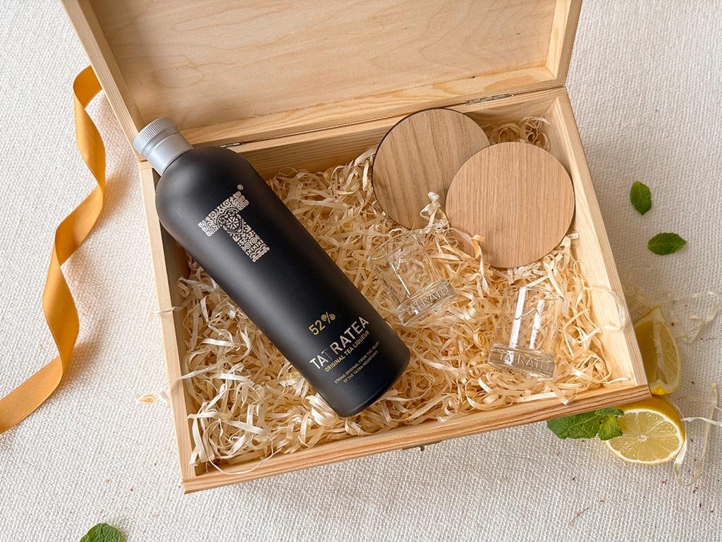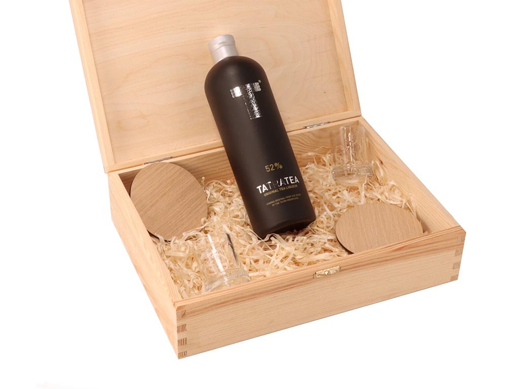 Darčeková súprava v drevenej krabičke ponúka dokonalú kombináciu bylinného likéru Tatratea 52% a originálneho darčeka na mieru. Poteší nielen znalcov a milovníkov dobrého pitia. Je ideálnym darčekom k narodeninám, k narodeniu dieťaťa, radosť urobí novomanželom, ale aj obchodným partnerom.