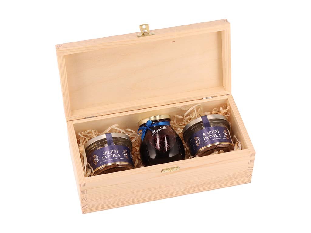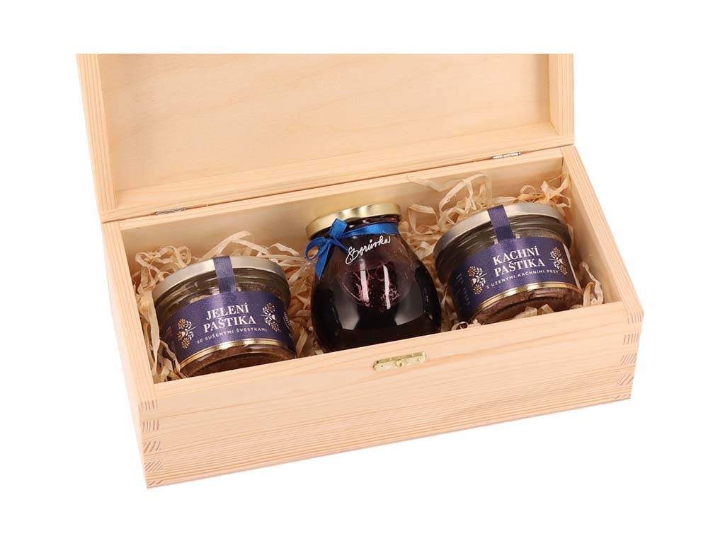 Darčekové balenie dvoch paštét a čučoriedkového džemu ocení každý milovník dobrého jedla, pretože táto kombinácia tvorí jedinečný gurmánsky zážitok. Balenie pre vás na želanie doplníme gravírovaným textom aj obrázkom, a tak získate originálny darček, ktorý zaručene poteší.