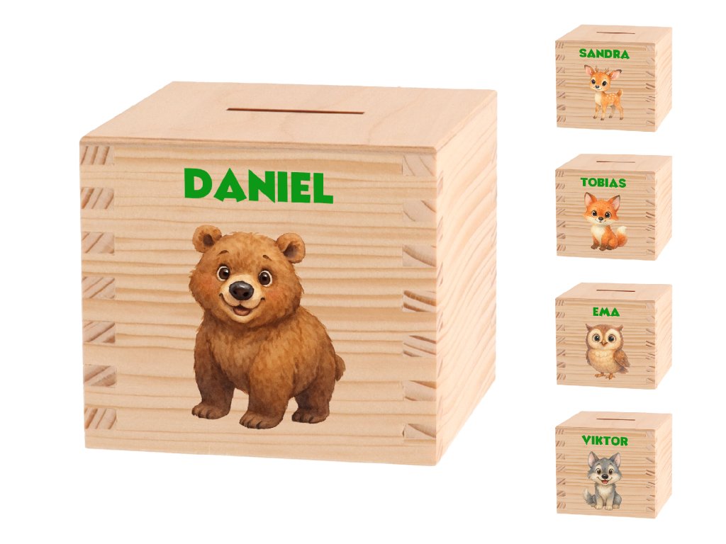 Drevená pokladnička s menom je skvelý darček k narodeninám, na Vianoce aj za prvé vysvedčenie v škole. Naučte deti finančnej gramotnosti hravou formou!