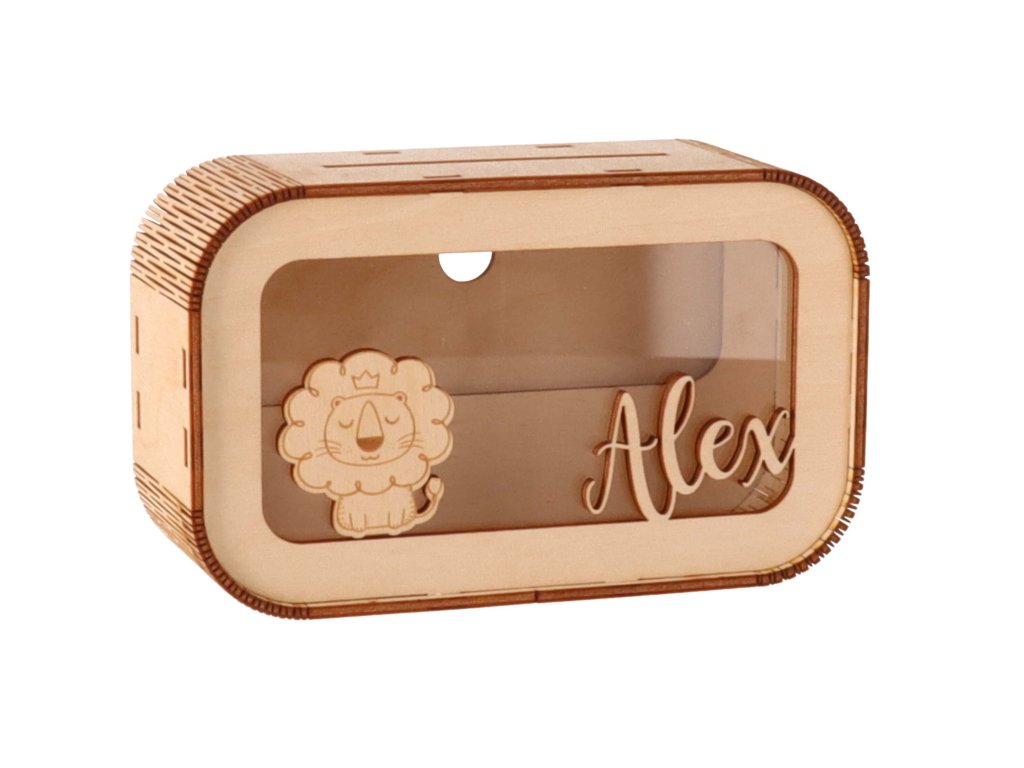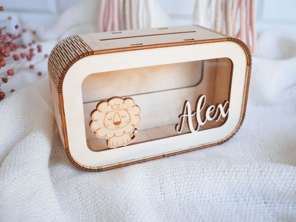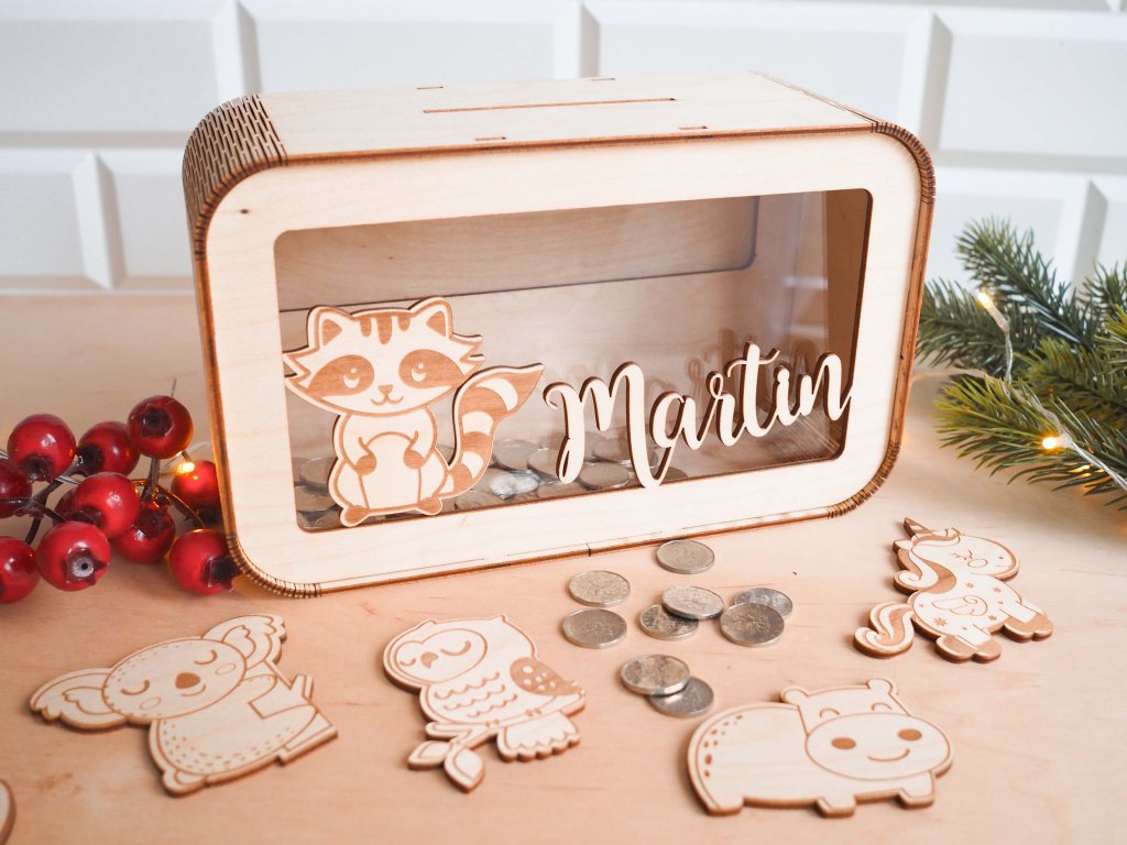 Drevená pokladnička s menom majiteľa a obľúbeným zvieratkom je ideálna pre všetky deti, ktoré si chcú šetriť na svoje sny. Unikátny vzhľad pokladničky zaručuje, že sa stane obľúbenou dekoráciou v detskej izbe.