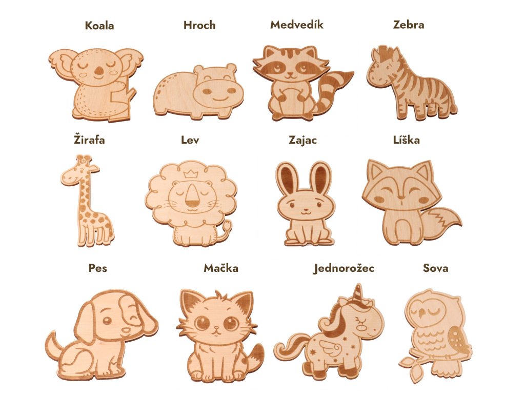 - Jedno z nasledujúcich zvieratiek: koala, lev, žirafa, hroch, zebra, medvedík čistotný, líška, zajac, sova, pes, mačka a jednorožec.