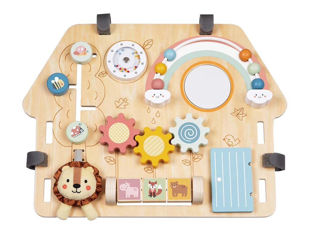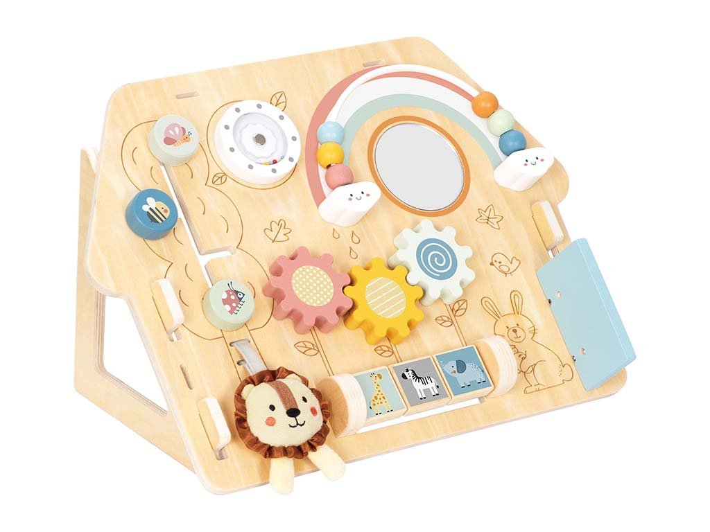 Drevená interaktívna tabuľa plná aktivít prináša deťom radosť z objavovania a učenia hrou. Obsahuje otočné ozubené kolieska, korálky na dúhovej dráhe, malé zrkadlo, pohyblivé prvky aj hebkého levíčka, ktorý nabáda k dotyku. Každý detail je navrhnutý tak, aby rozvíjal jemnú motoriku, koordináciu rúk a očí, logické myslenie aj zmyslové vnímanie.