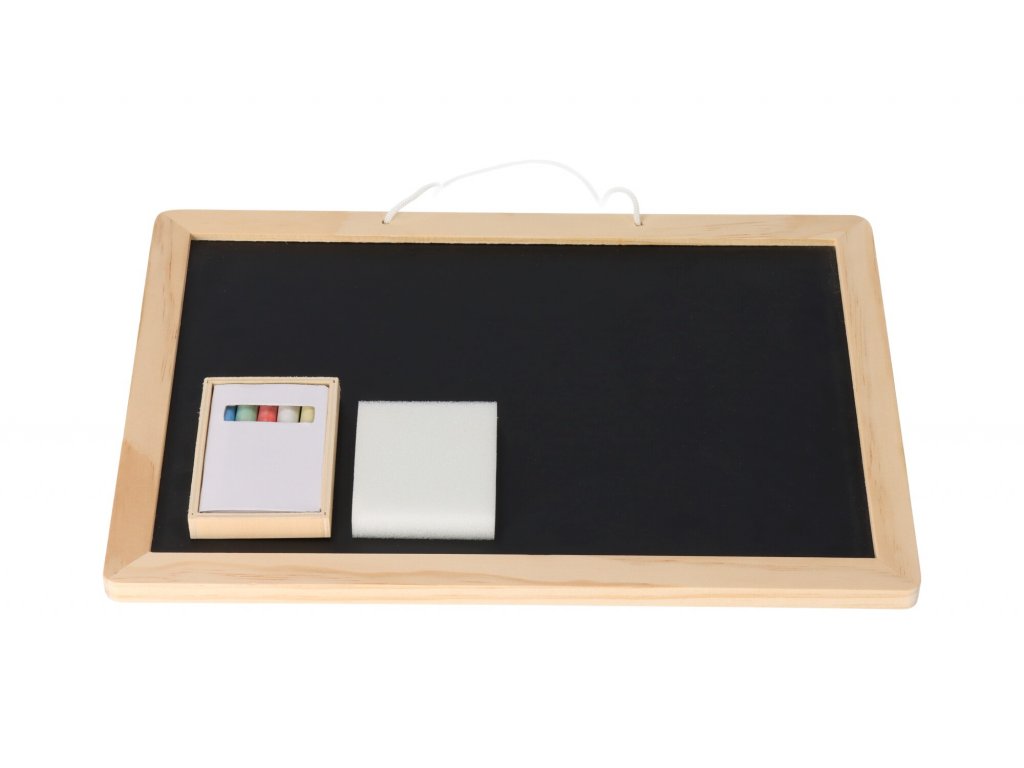 Tabuľa sa dá zavesiť na stenu, balenie obsahuje farebnú kriedu a hubku.