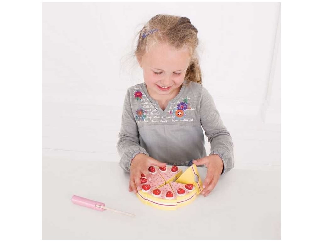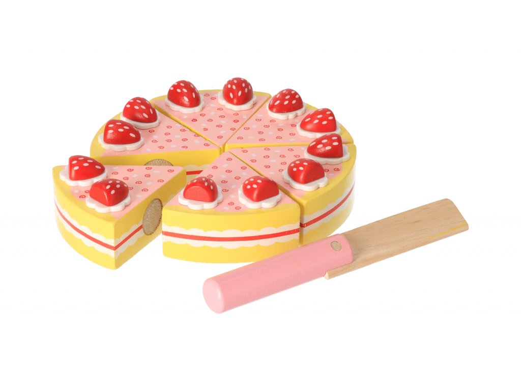 Drevená torta s jahodami, ktorú si deti môžu krájať a následne opäť spojovať pomocou suchého zipsu. Súčasťou balenia je drevený nôž. Drevené hračky pre deti sú nadčasové. Budú sa páčiť niekoľkým generáciám. Torta je vyrobená z kvalitného dreva a zdravotne neškodných farieb.