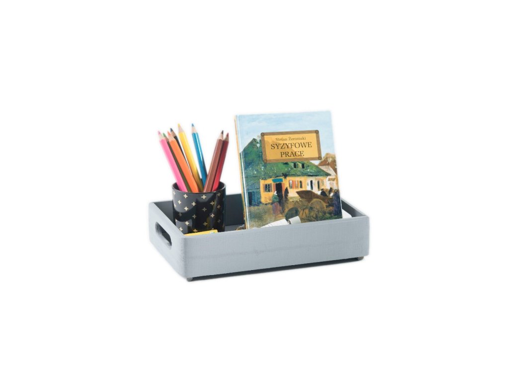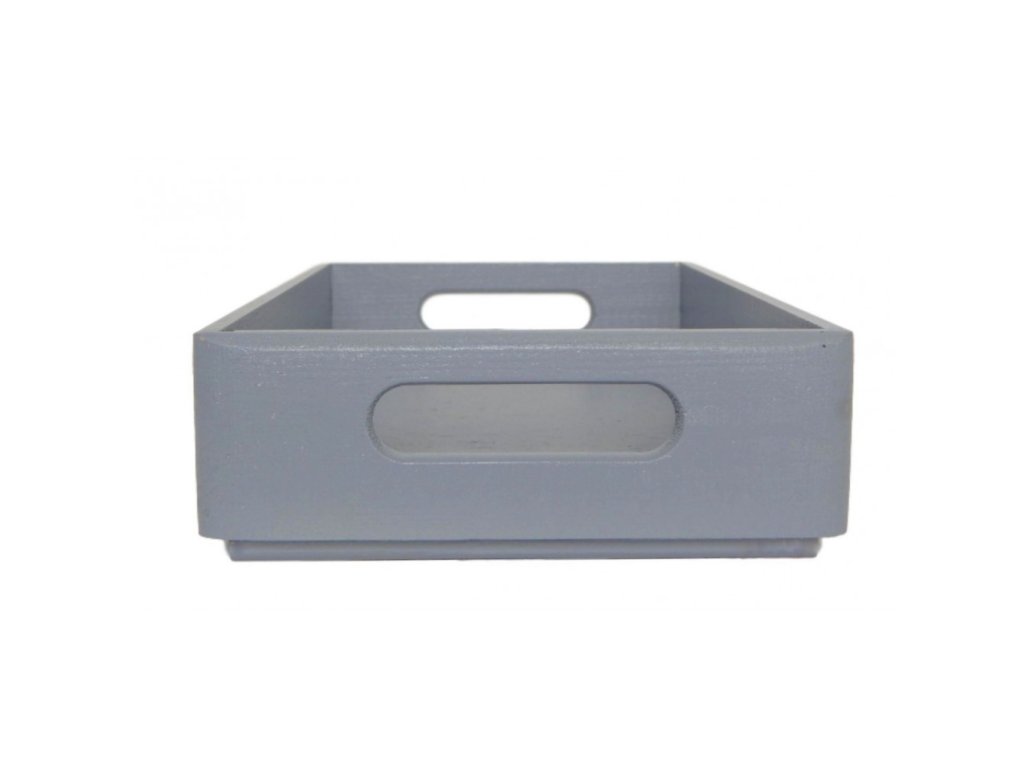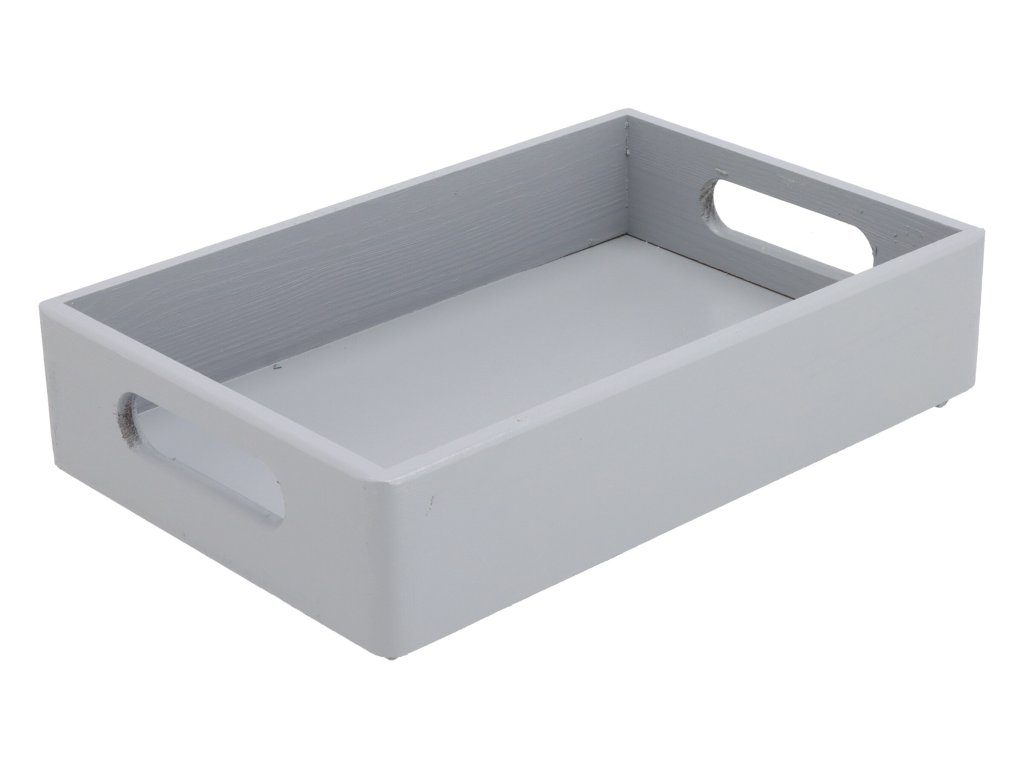 Sivá drevená debnička sa dá využiť ako tácka na prenášanie drobných vecí, ale taktiež na uloženie rôznych drobností.