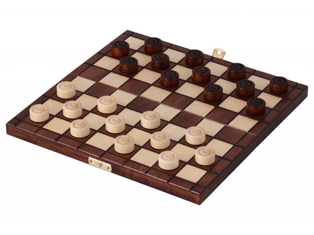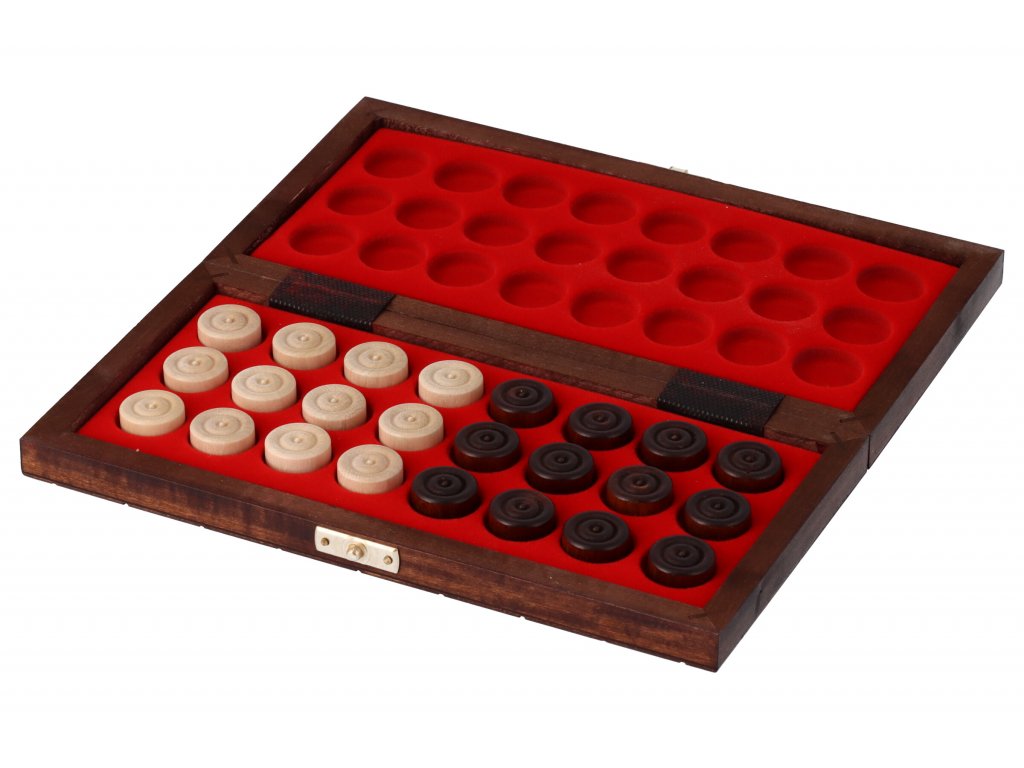 Do detailu prepracovaná drevená dáma s hracou plochou 25 x 25 x 2 cm. Figúrky priemeru 20 mm sú uložené v presne padnúcom čalúnenom priestore.