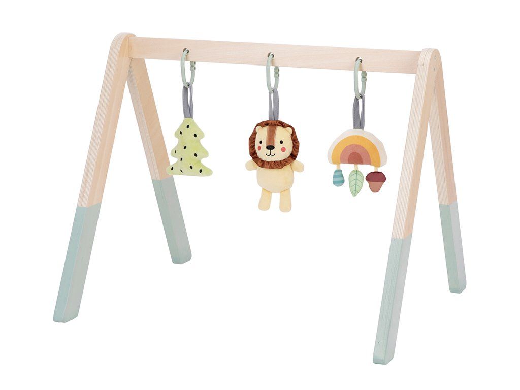 Štýlová drevená hrazdička s textilnými závesnými hračkami je ideálnou pomôckou pre rozvoj motoriky a zmyslového vnímania bábätiek. Farebné a mäkké hračky v podobe zvieratiek a tvarov lákajú k dotýkaniu, uchopovaniu a objavovaniu, čím podporujú koordináciu očí a rúk aj prvé pohyby dieťaťa.