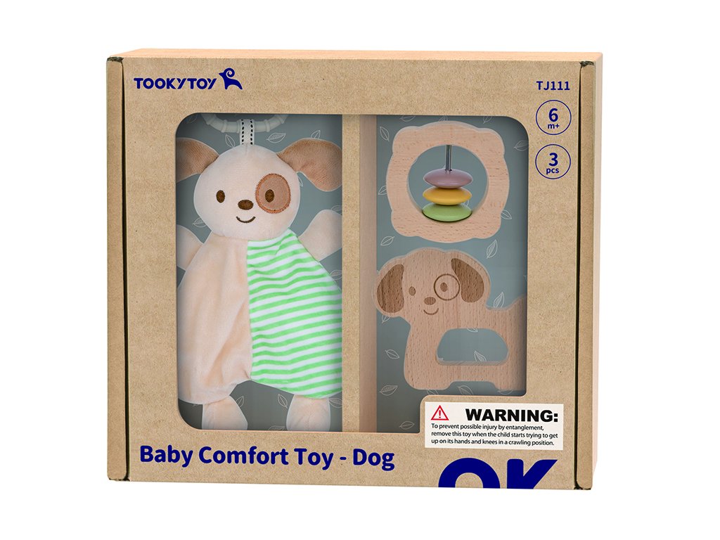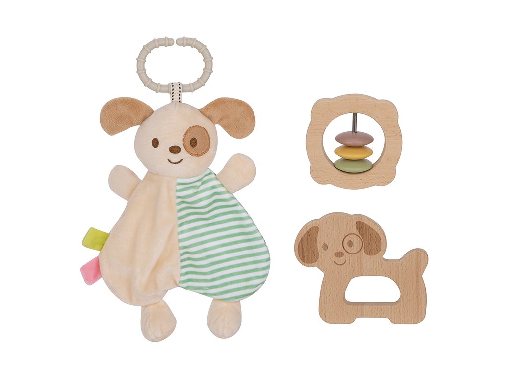 Balenie obsahuje mäkkého textilného psíka, drevenú hrkálku s farebnými krúžkami a hračku v tvare psíka. Jednotlivé produkty sú navrhnuté tak, aby sa dobre držali v malých detských rúčkach, rozvíjali jemnú motoriku a poskytovali deťom pocit upokojenia, napríklad pri prerezávaní prvých zúbkov.