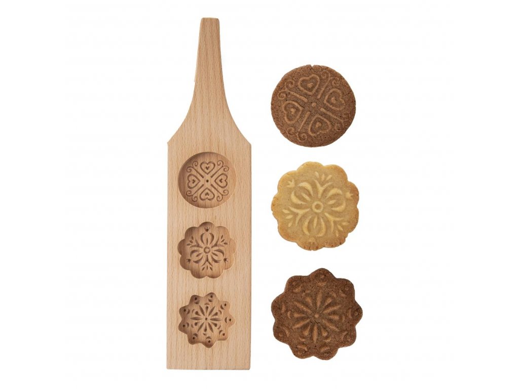 Formička je vyrobená z prírodného bukového dreva a obsahuje tri okrúhle formičky s krásnym zdobením. Využijete ju na výrobu vytláčaných zdobených perníkov, cukroviniek alebo sušienok.