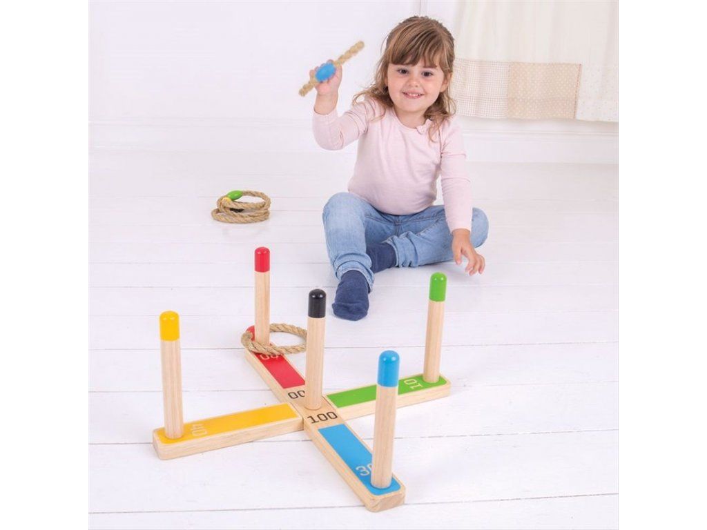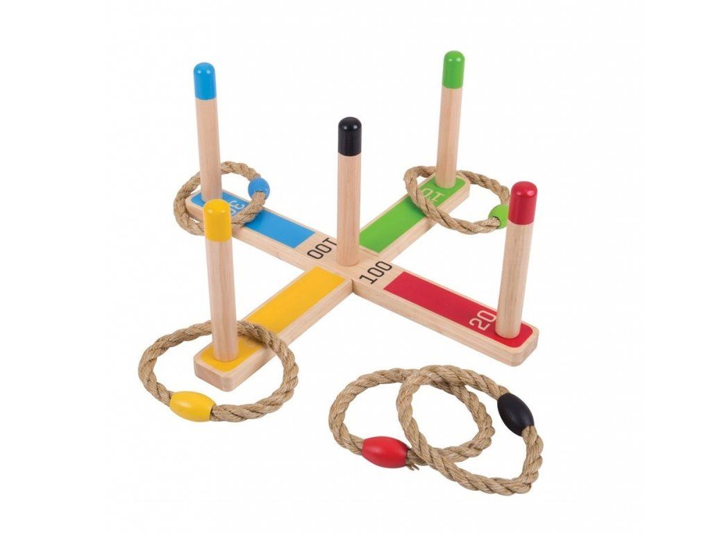 Zábavný spôsob ako trénovať obratnosť. Cieľom je hodiť 5 pletených kruhov z tenkého lana na drevený kríž s tyčami a získať tak čo najviac bodov.