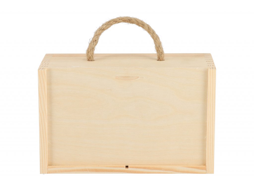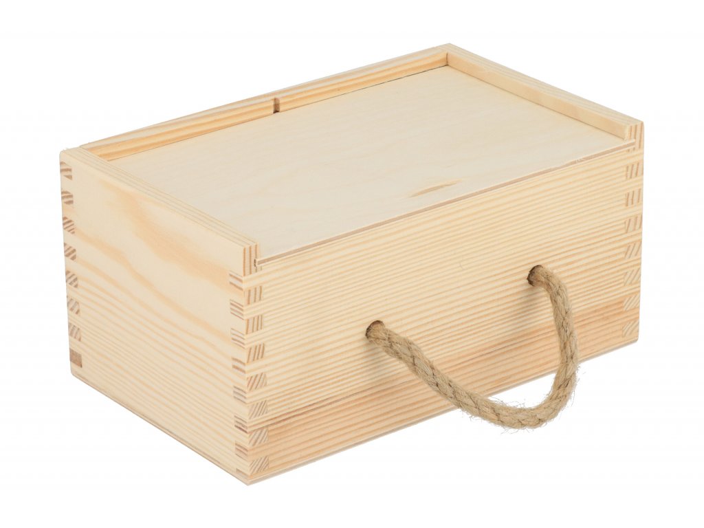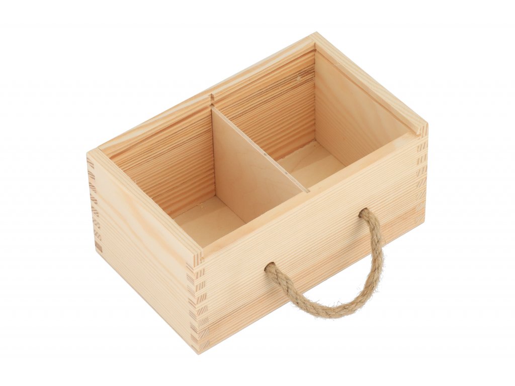 Vnútorný rozmer jednej priehradky je 10,5 x 9 cm, vnútro môžete vyplniť napríklad drevenou vlnou. Veko z pevnej preglejky sa ľahko vysúva a deliacu stenu je možné z krabičky vytiahnuť.