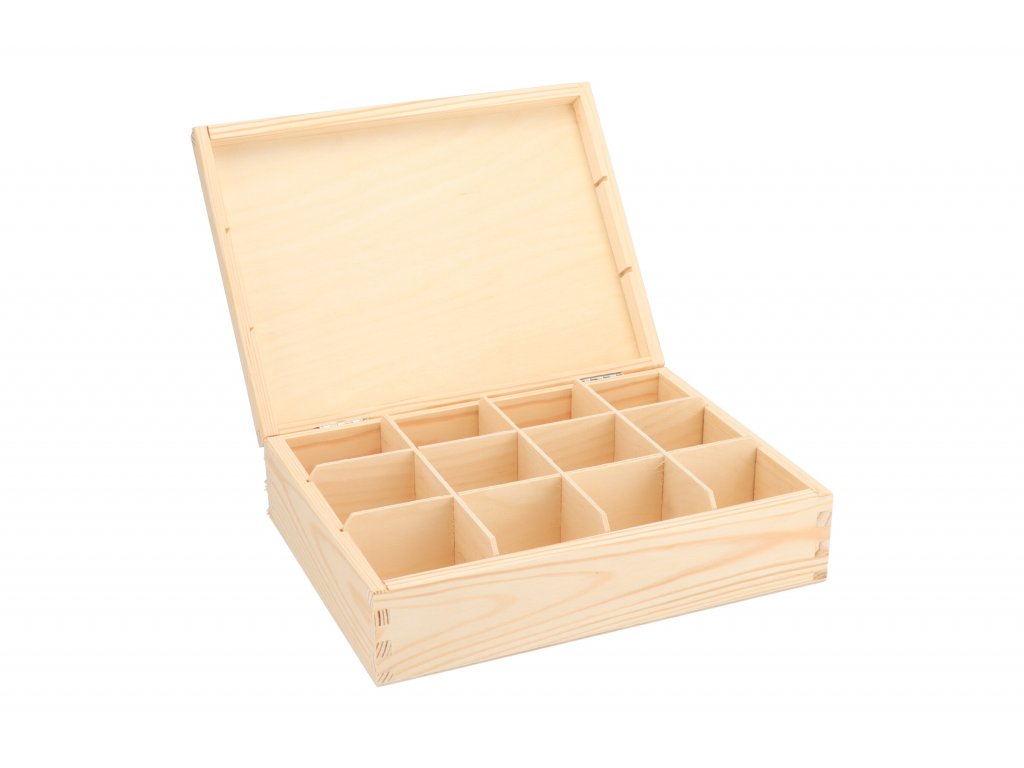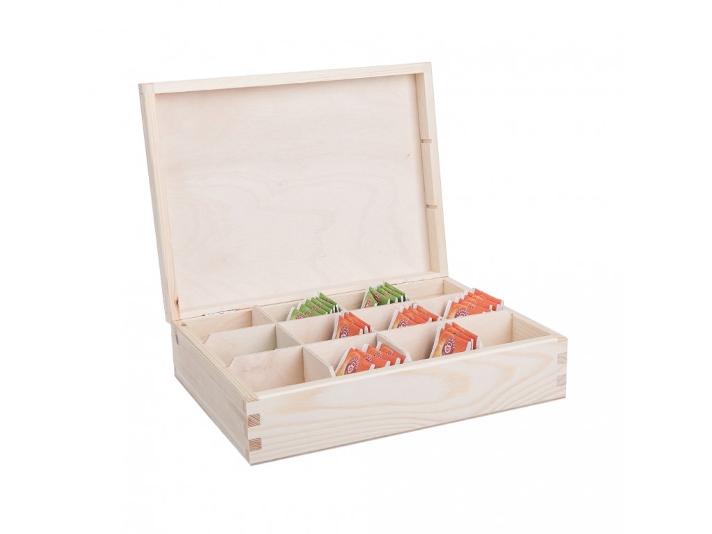 Krabička je vyrobená z borovicového dreva a má 12 priehradiek, takže je dostatočne priestranná, aby sa do nej vliezli všetky vaše obľúbené čajové vrecúška.
