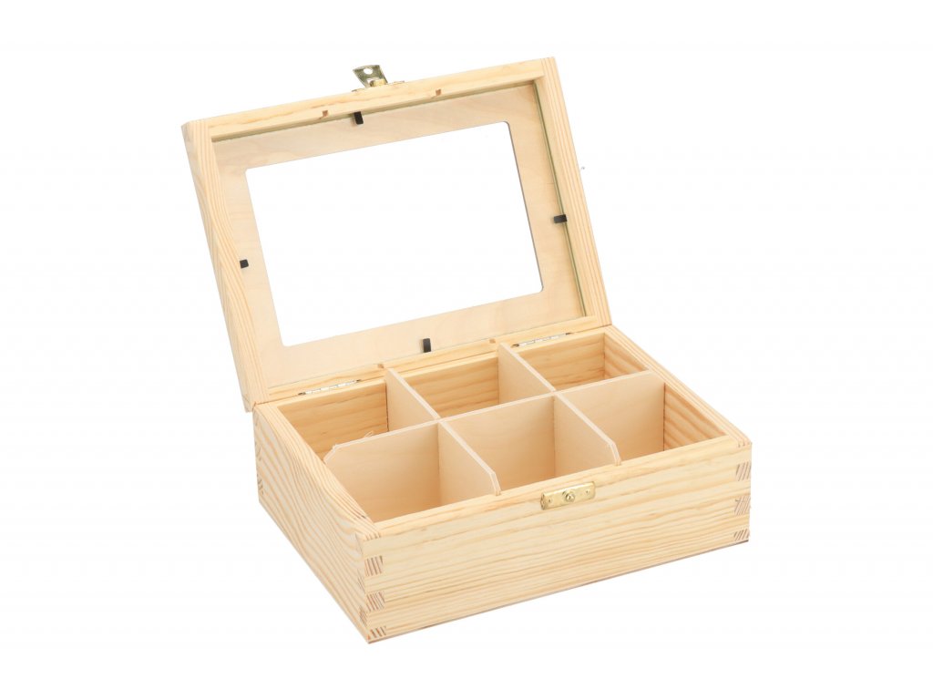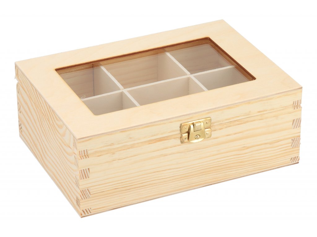 Krásna drevená krabička s bezpečným zatváraním, do ktorej si uložíte všetky svoje obľúbené čaje. Môžete ich v tejto podobe veľmi elegantne a štýlovo ponúkať aj návšteve. Vnútro je rozdelené na 6 priehradiek, ktoré oddelia rôzne druhy čajov. Vďaka priehľadnému sklenenému veku budete mať nad obsahom stále prehľad.