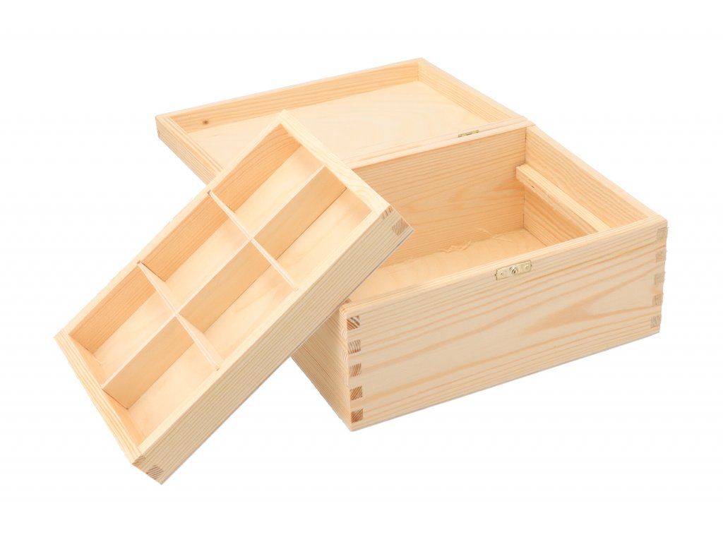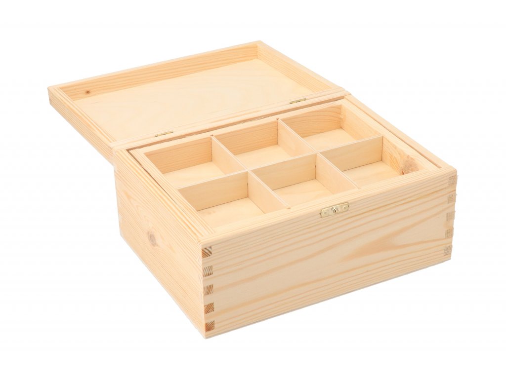 Táto krásna krabička z borovicového dreva má praktické veko a 6 priehradiek, do ktorých môžete ukladať svoje poklady.