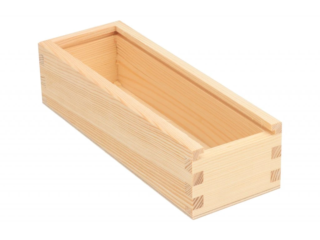 Je vyrobená z borovicového dreva a preglejky. Vnútorné rozmery sú 21 x 6 x 4.5 cm.