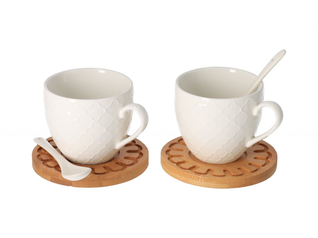 Drevená podložka pod pohár z bambusu s porcelánovým hrnčekom a lyžičkou. Balenie obsahuje 2 komplety (podložka pod pohár, hrnček, lyžička).