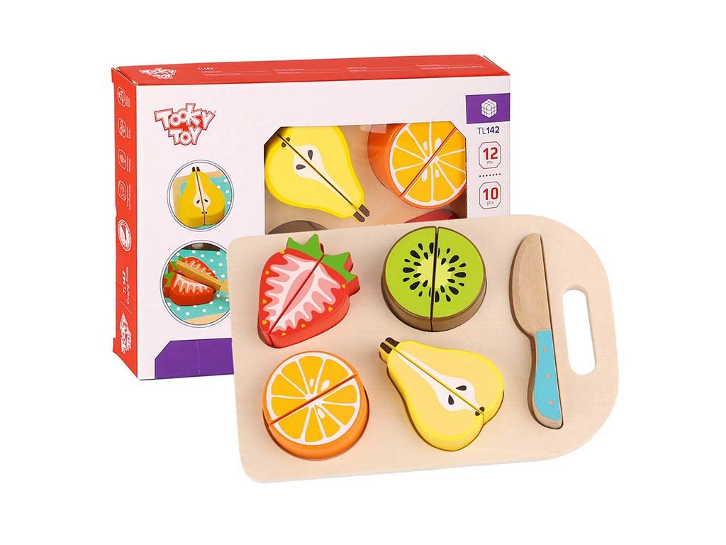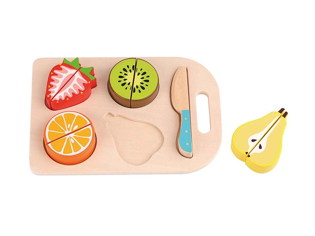Bezpečná a kreatívna hračka, ktorá deťom umožní pripravovať imaginárne desiaty. Obsahuje farebné kúsky ovocia, drevené prkénko a nožík – ideálny doplnok do detskej kuchynky či obchodíku.