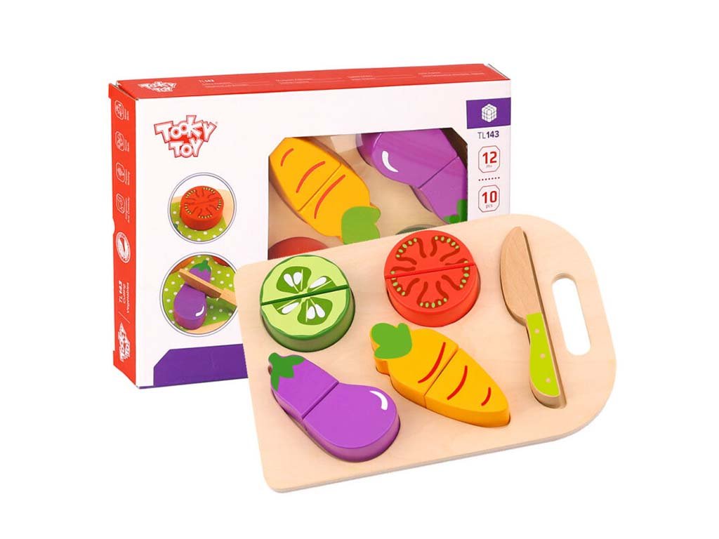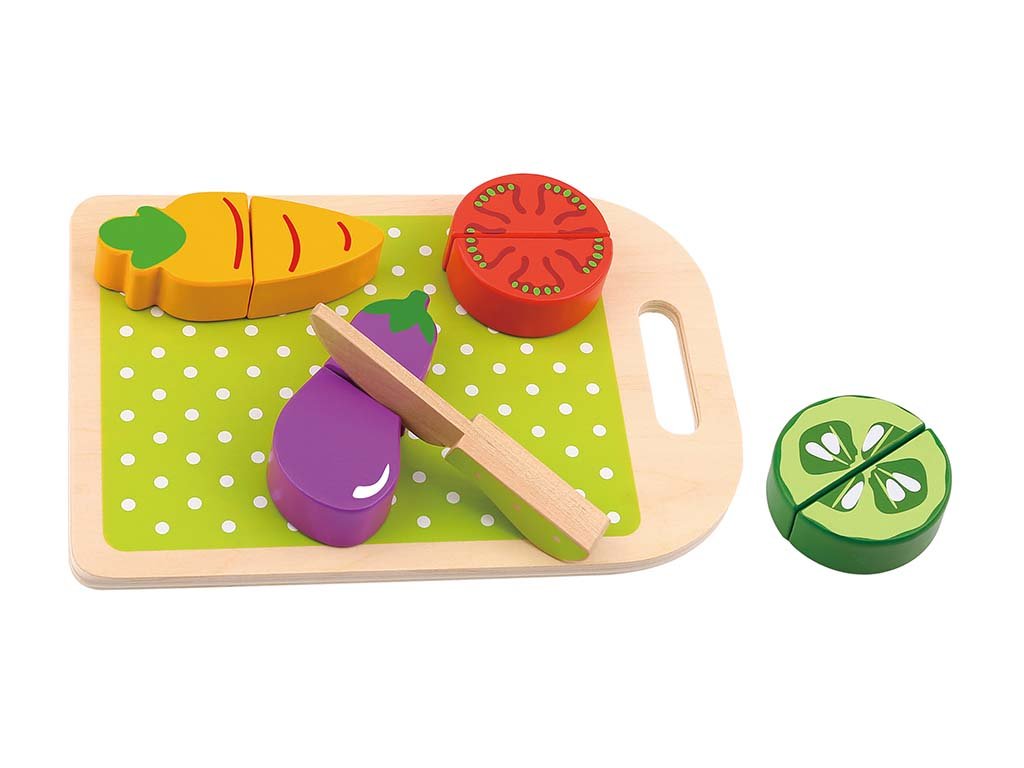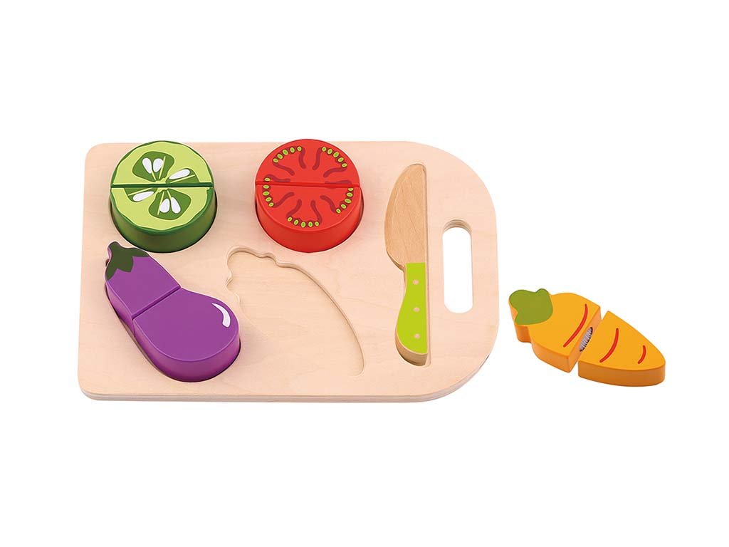 Bezpečná a kreatívna hračka, ktorá deťom umožní pripravovať imaginárne desiaty. Obsahuje farebné kúsky zeleniny, drevené prkénko a nožík – ideálny doplnok do detskej kuchynky či obchodíku.