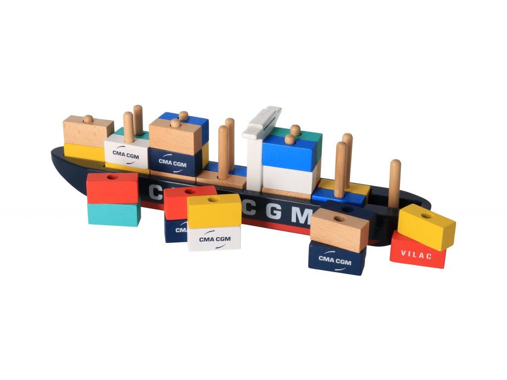 Celodrevená kontajnerová loď. Naložte loď kontajnermi a pripravte ju vyplávať. Hračka je skvelá aj ako dekorácia. S touto hračkou ľahko zabavíte svoje deti a budete mať chvíľku na vytúžený odpočinok.