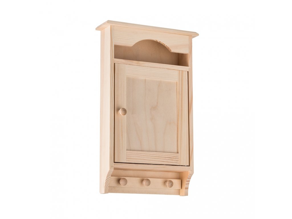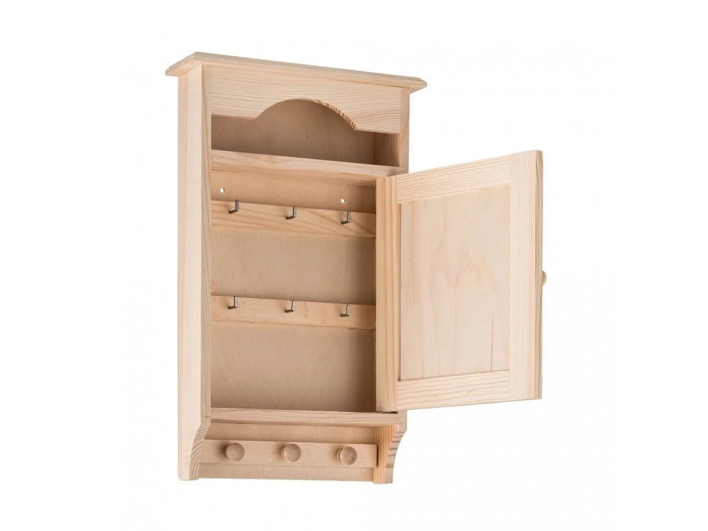 Krabička je vyrobená z borovice a vnútri nájdete kovové háčiky, ktoré slúžia na zavesenie kľúčov. Na spodnej strane skrinky sú drevené pútka, ktoré tiež oceníte.