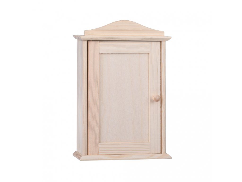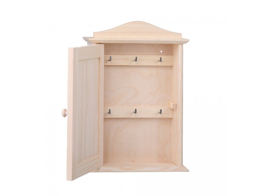 Krabička je vyrobená z borovice a vo vnútri nájdete háčiky slúžiace na zavesenie kľúčov. Na spodnej strane skrinky sú drevené pútka, ktoré tiež určite oceníte.