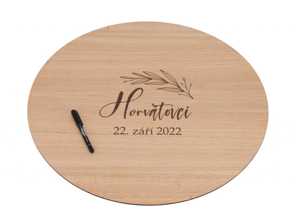 Minimalistický motív s lístkami vyniká na svetlej podpisovej ceduli z dubového dreva. Skvele sa bude hodiť predovšetkým pre svadbu v boho štýle a po obrade vám poslúži ako krásna upomienková dekorácia.