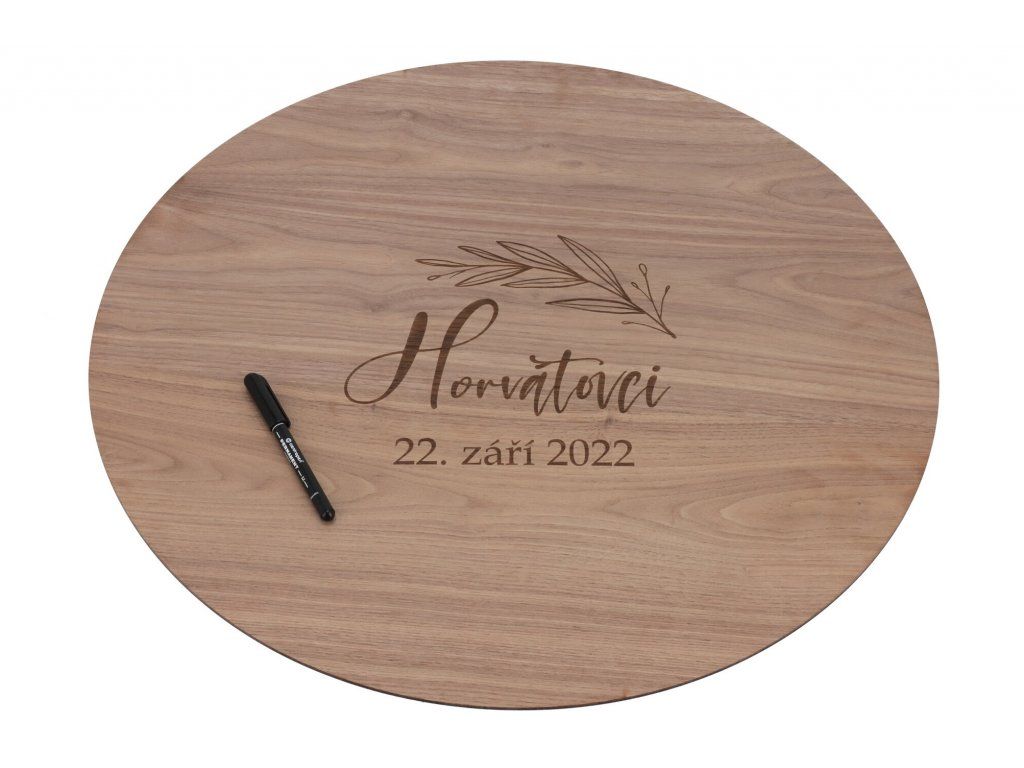 Orechové drevo je kúzelné pre svoju kresbu a odtieň, s jemným symbolom lístkov potom tvorí ideálnu kombináciu pre svadobnú ceduľu na podpisy hostí. Nech je vaša láska pevná a stála ako drevo orecha!