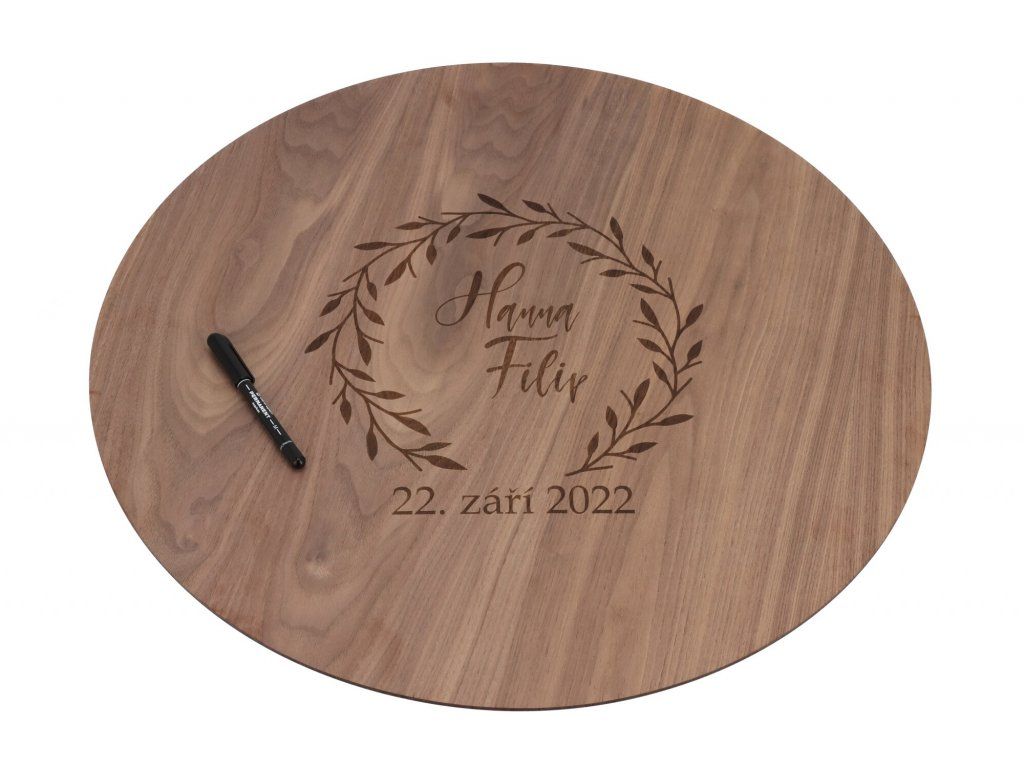 Drevená svadobná ceduľa na podpisy orech - veniec