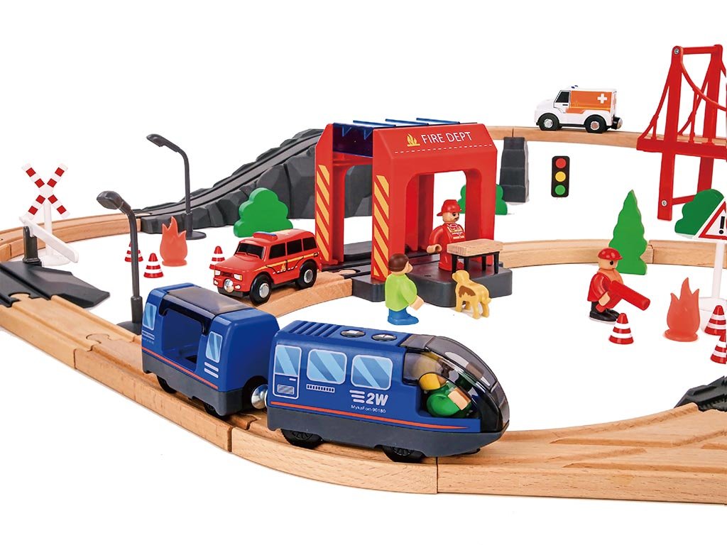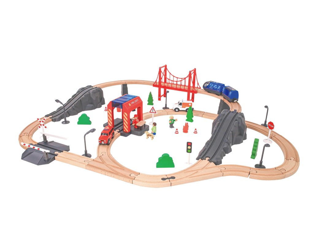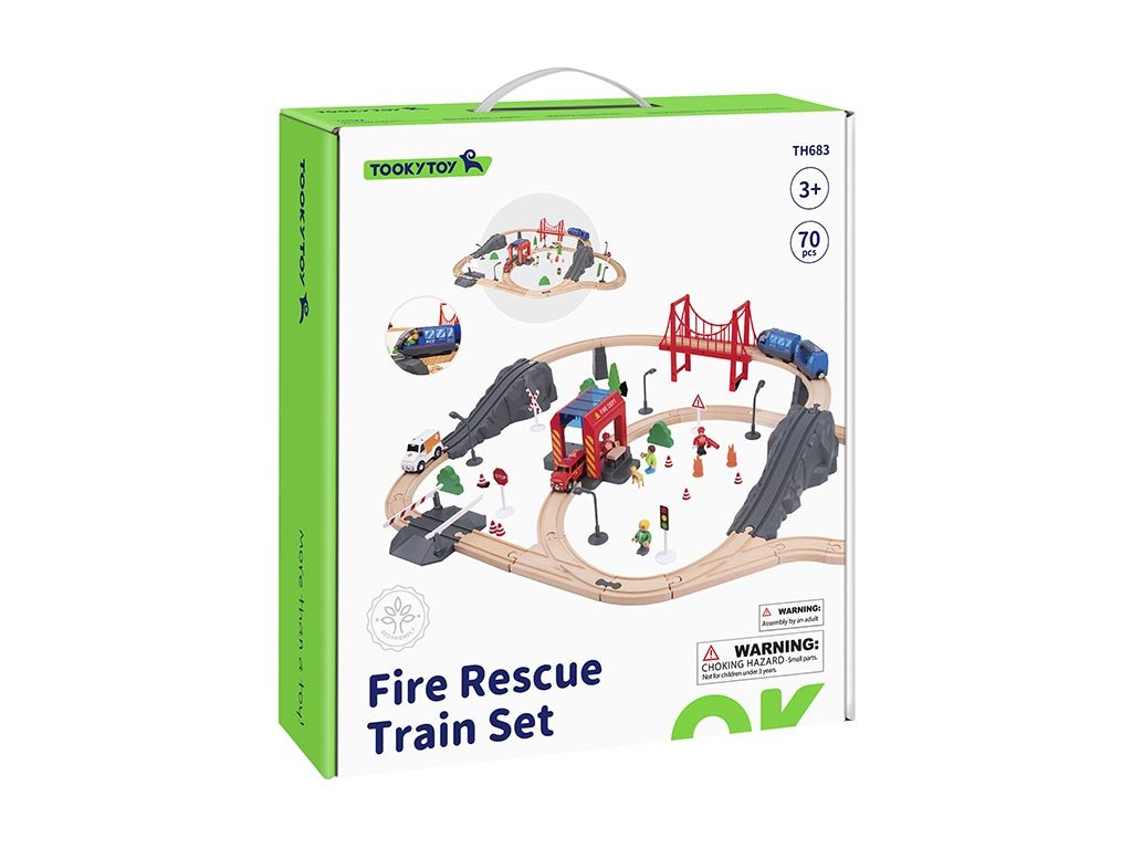 Drevená vláčiková dráha obsahuje 70 dielikov, ktoré po zostavení vytvoria jedinečné dobrodružstvo. Súčasťou sady je napríklad hasičské auto, sanitka, figúrka hasiča, dopravné značky, železničné osvetlenie, stromy, kríky a mnoho ďalších doplnkov. Vďaka nim si deti môžu vytvárať vlastné príbehy a scenáre záchranných akcií, ktoré podporujú ich fantáziu a kreativitu.