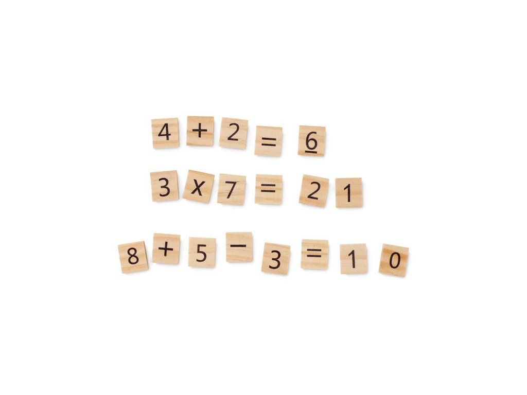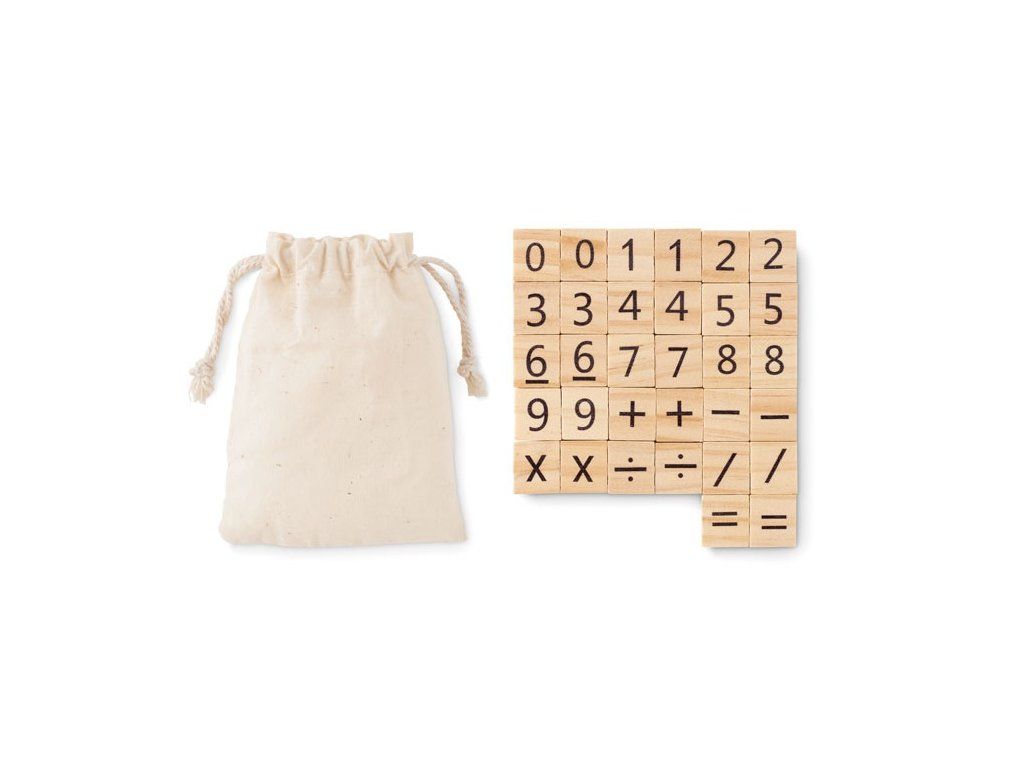 Súprava obsahuje vždy po dvoch číslach od 0 do 9 a matematické symboly + - × ÷ = /. Kocky s rozmermi 1,8 x 2 x 0,5 cm sú vyrobené z najkvalitnejšieho bukového dreva a uložené v bavlnenom vrecku.
