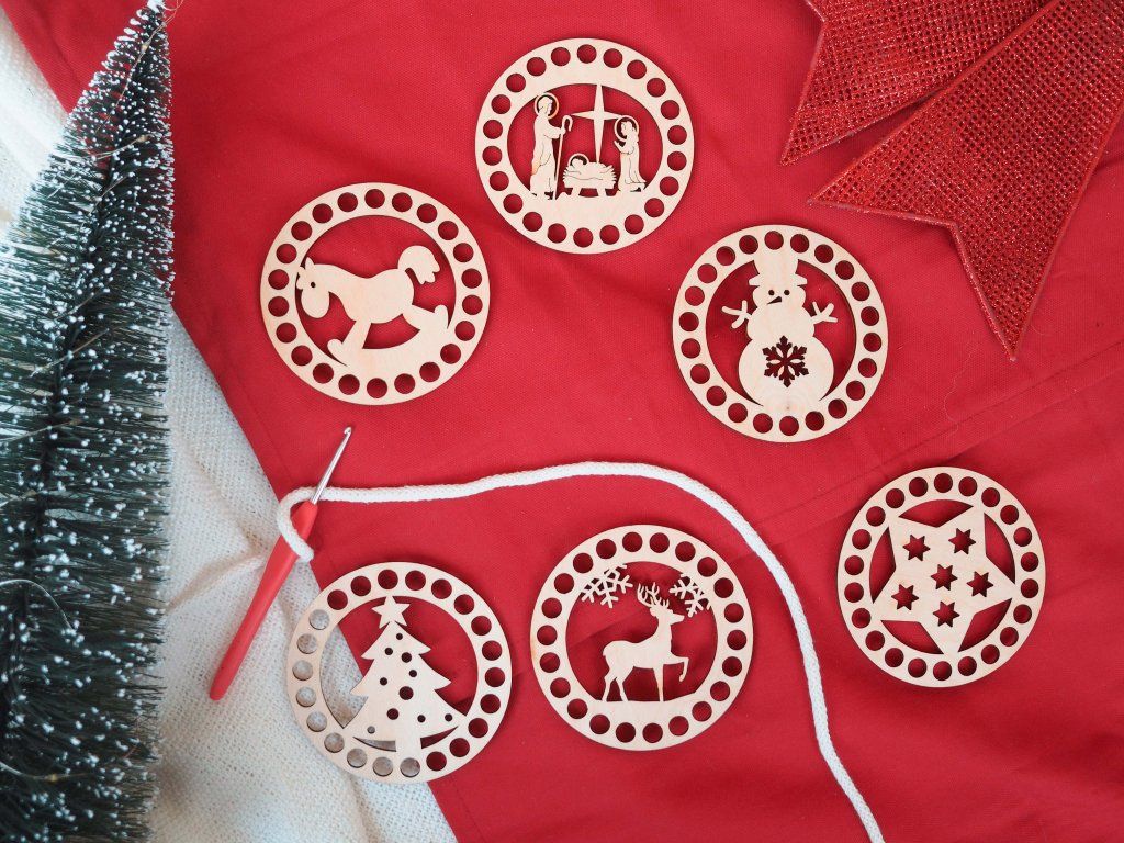 Šesť okrúhlych ozdôb s vyrezávaným vianočným motívom slúži ako základ na výrobu háčkovaných dekorácií. Hotové banky rozžiaria váš sviatočný interiér, ale skvele sa hodia aj ako originálny darček.